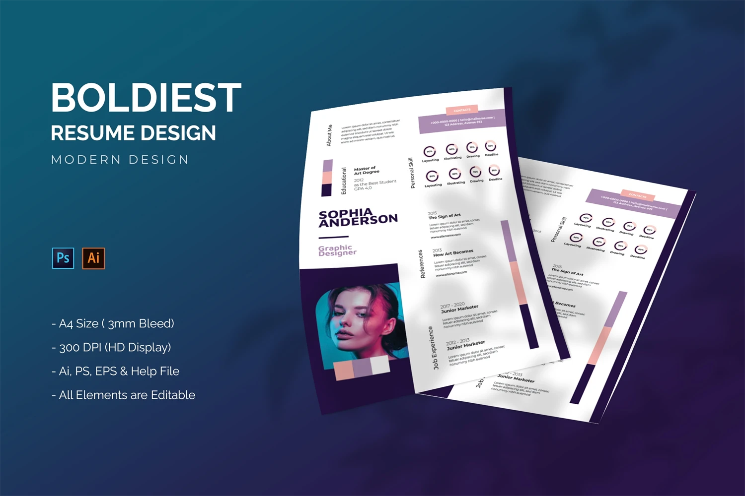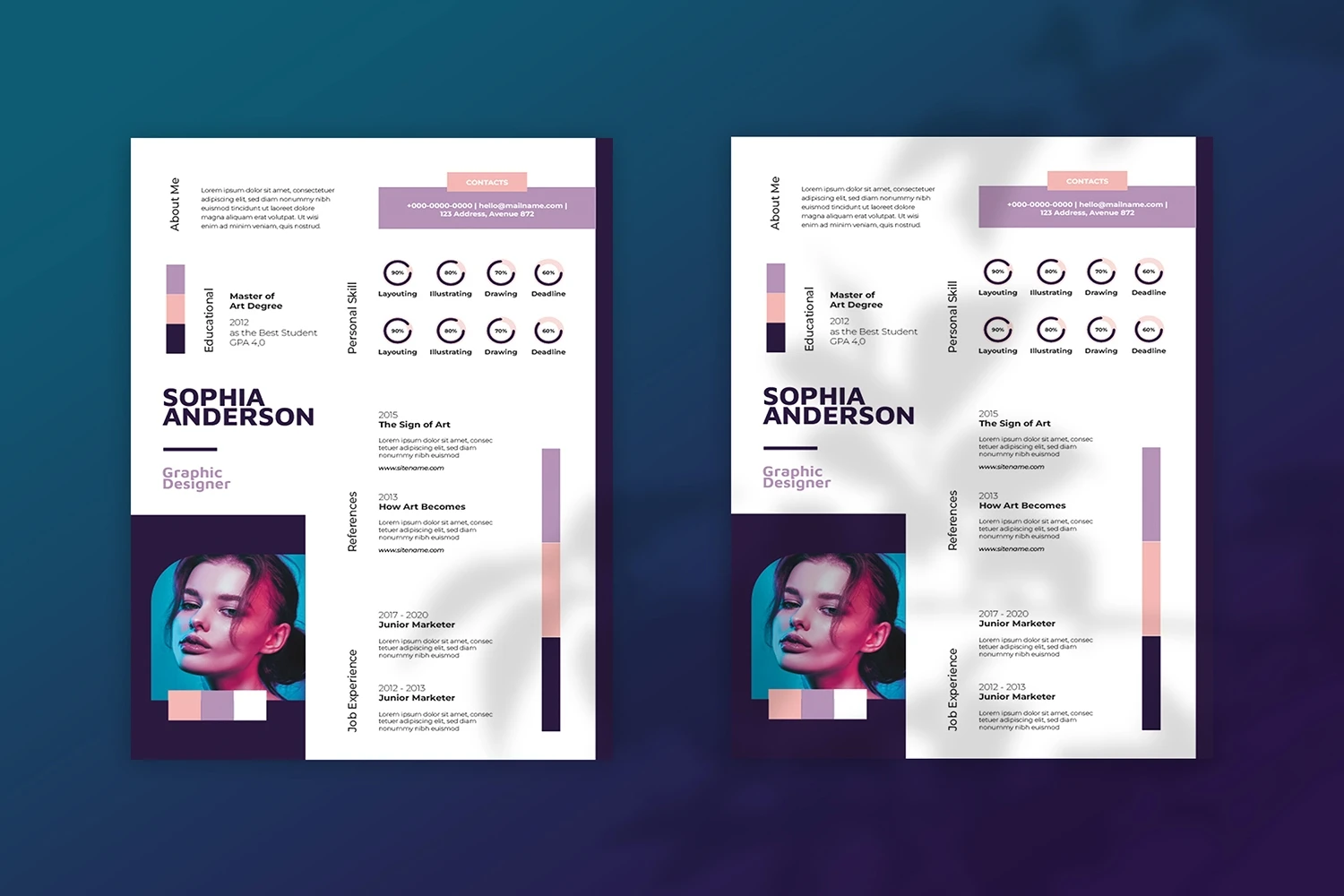 This CV resume design template lets you tell your story to potential employers or collaborators by showcasing your skills, experience, and accomplishments. It presents your credentials clearly and professionally to draw attention and highlight your strengths.