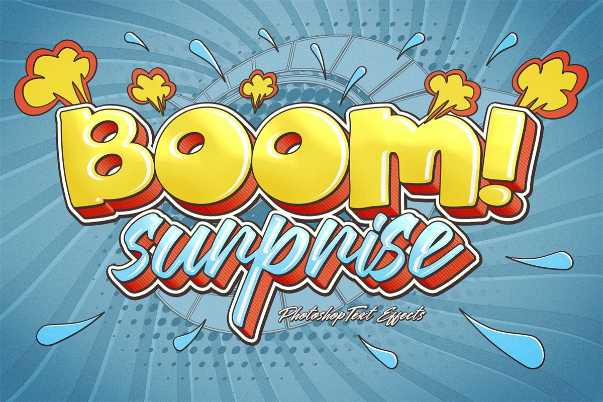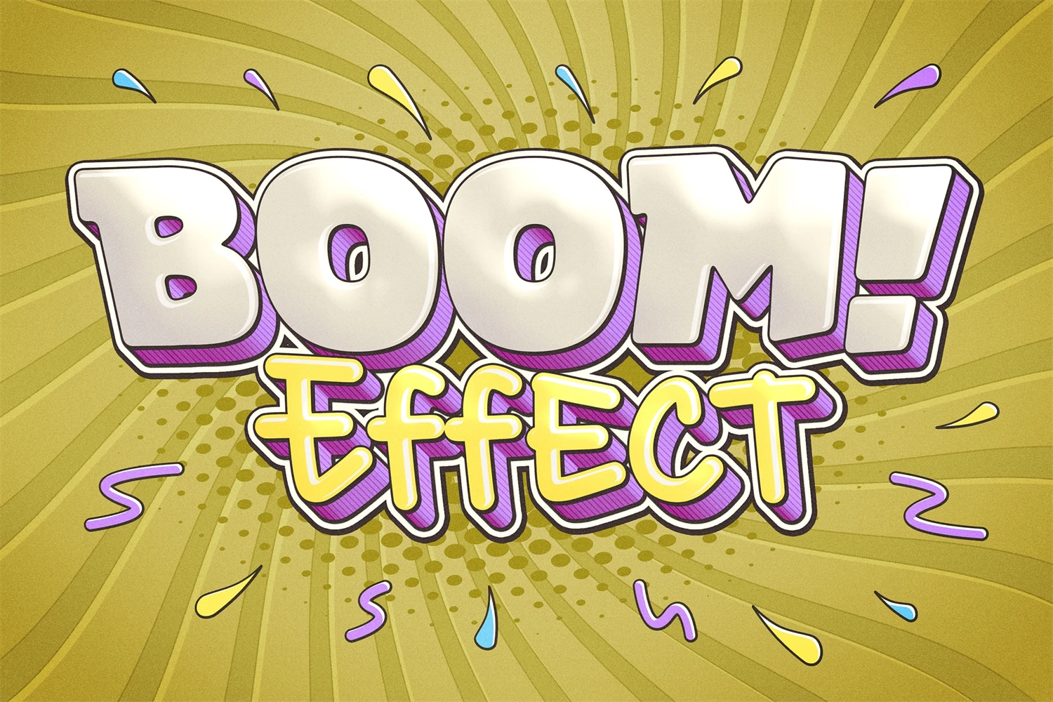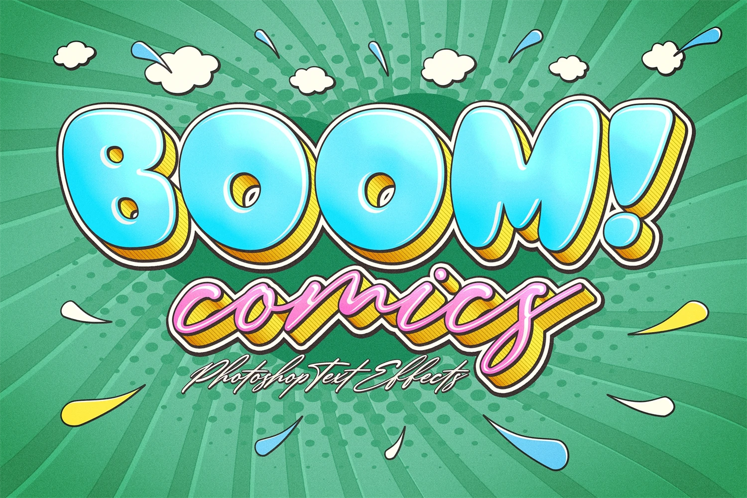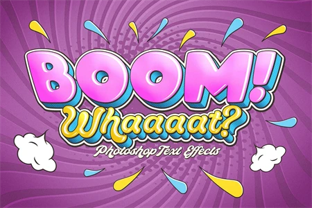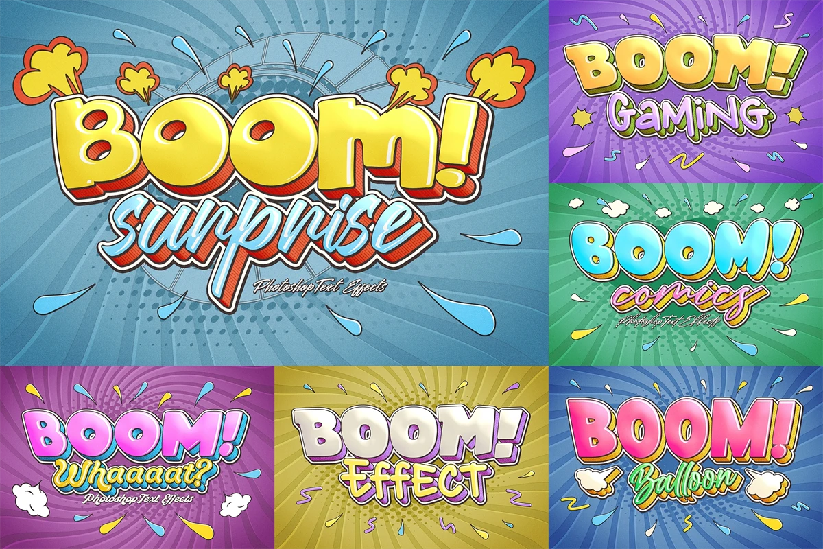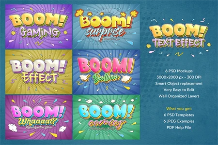 Get 6 Photoshop templates with colorful, comics style text effects. Boom lettering in comics style, rays on the background.
