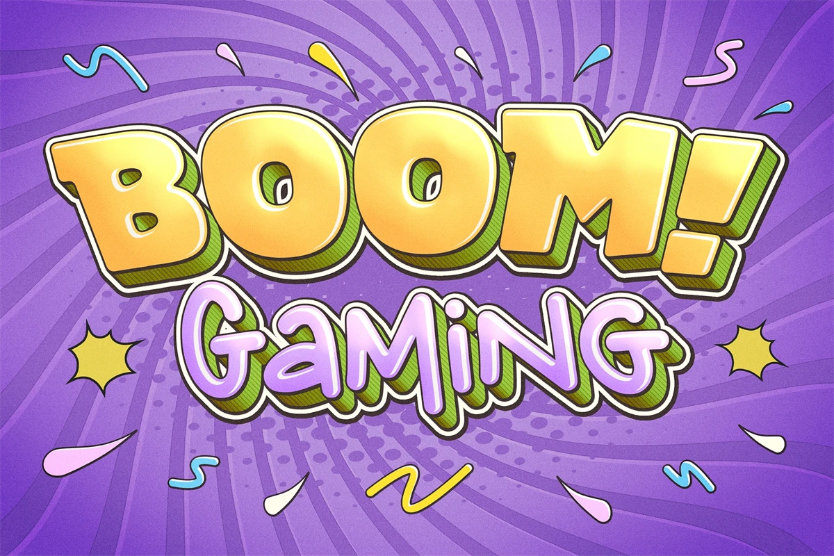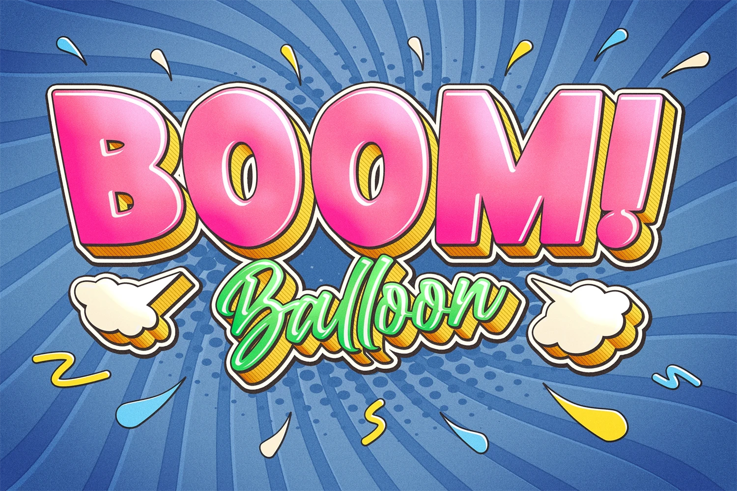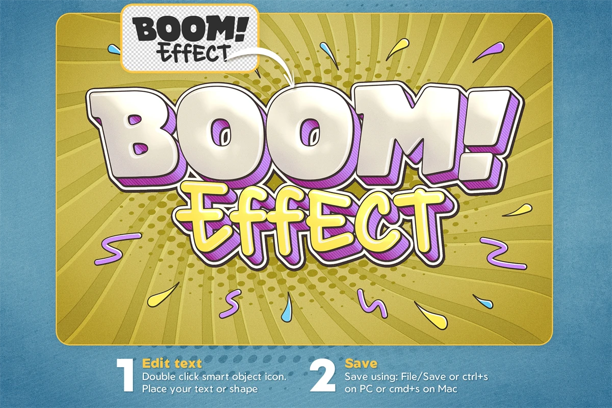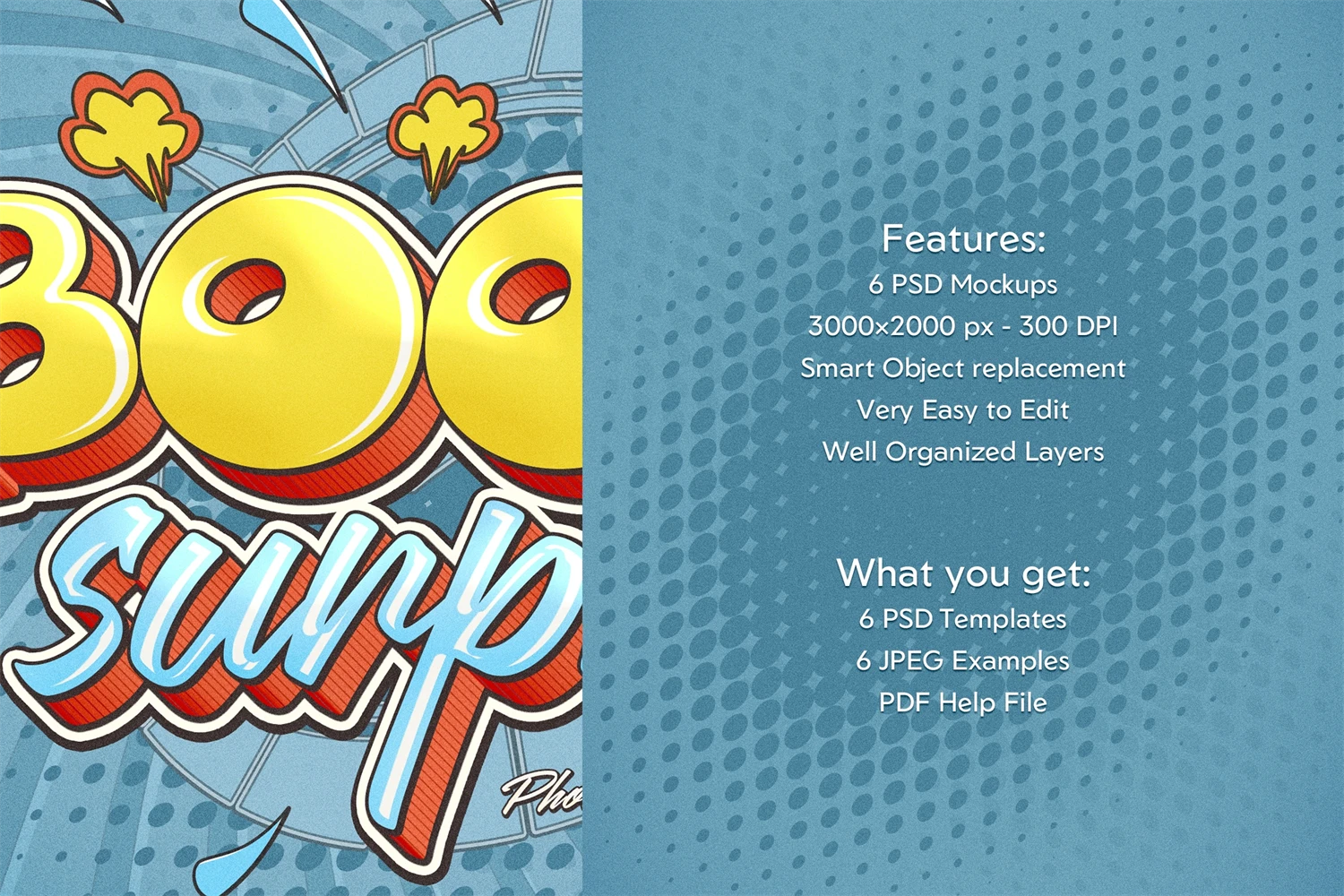 Get 6 Photoshop templates with colorful, comics style text effects. Boom lettering in comics style, rays on the background.