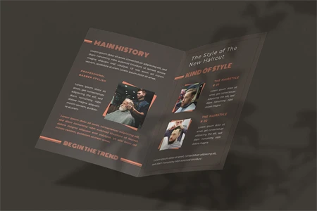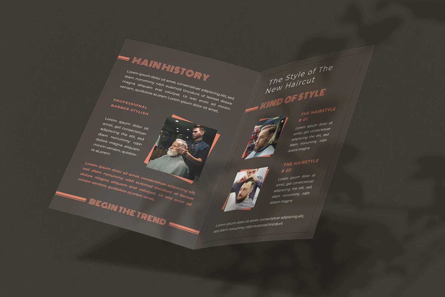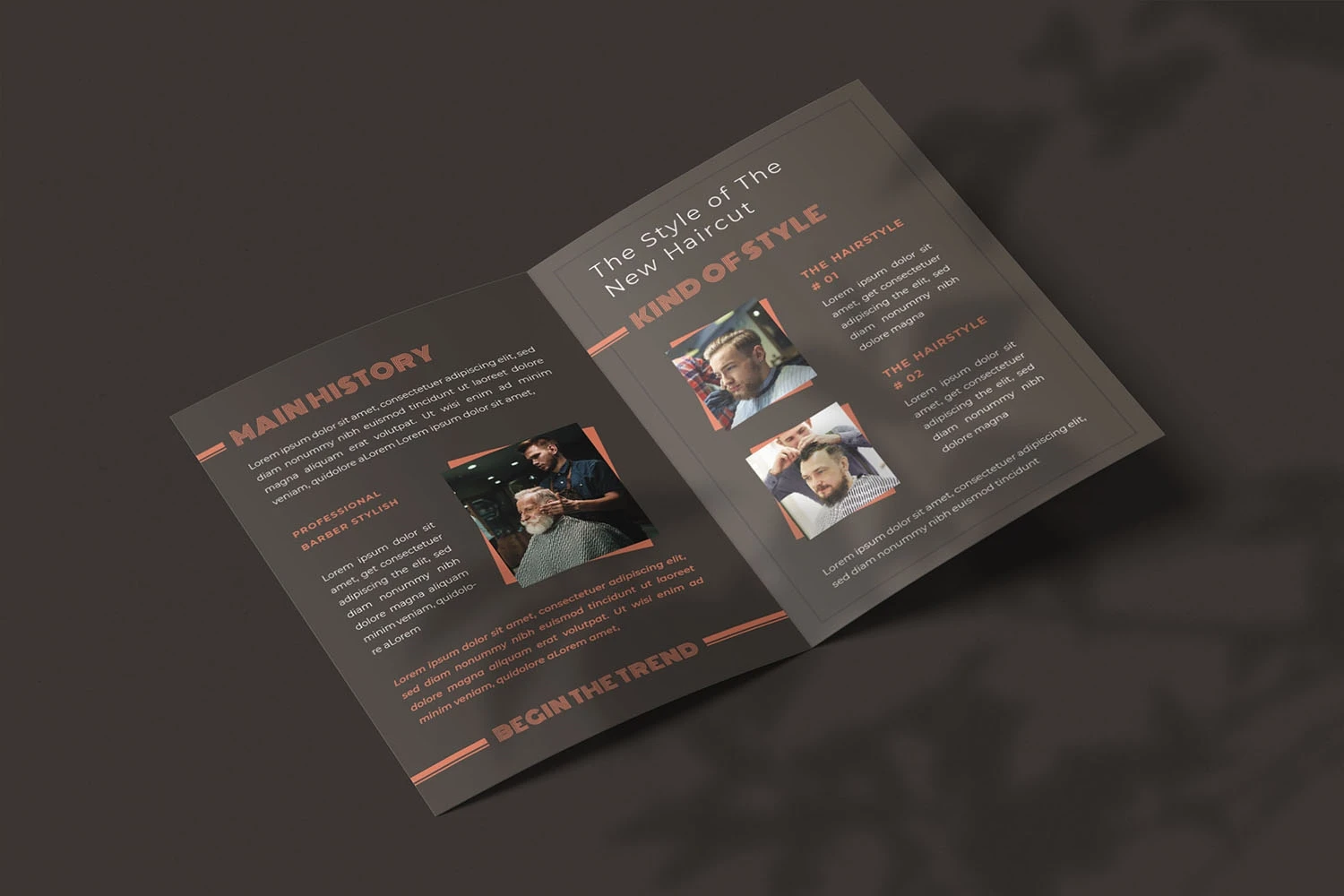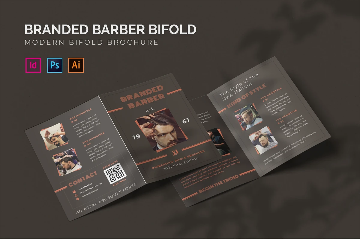 Branded Barber - Bifold Brochure We present this Bifold Brochure for you, simple and very elegant, and this Bifold Brochure is suitable for all types of your business, made with Adobe InDesign (INDD), Adobe Photoshop (PSD) and Adobe Illustrator (AI), very easy to customize, Hope you Like it, dont forget to rate, Thanks.