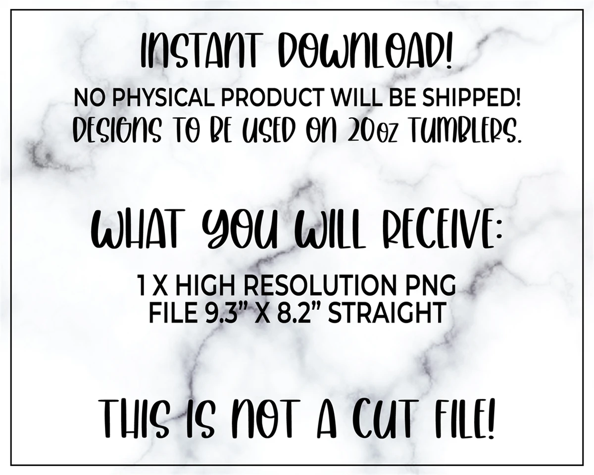 This listing is for an instant downloadable file designed to be used on 20oz skinny tumblers. No physical products will be shipped as this is an instant download. Refunds and/or cancellations are not permitted on digital downloads. Please contact me if you have any issues with the files.