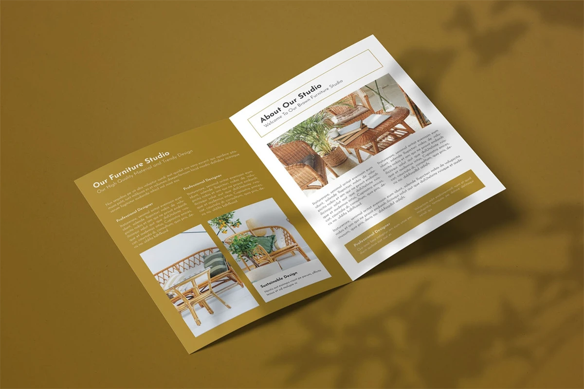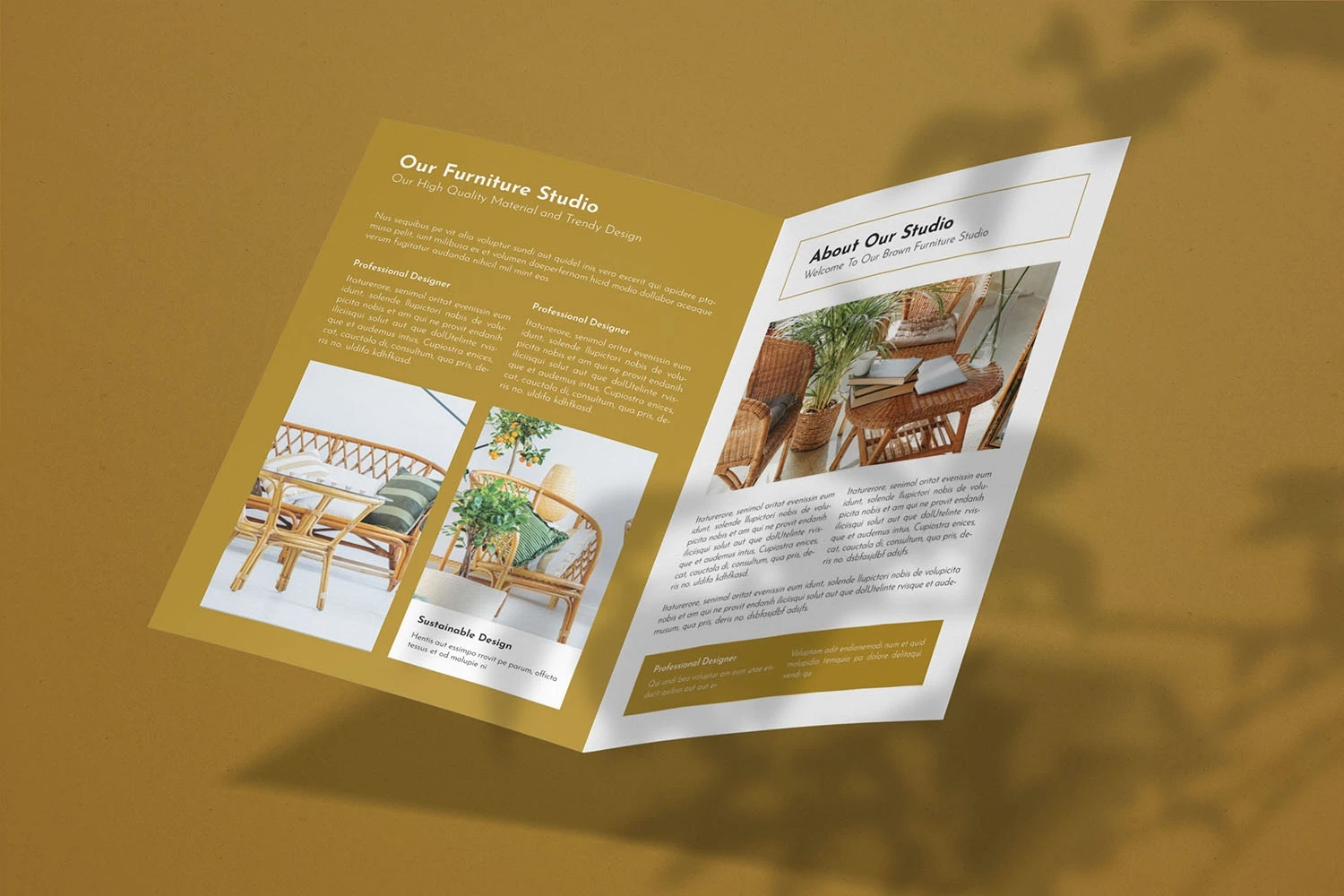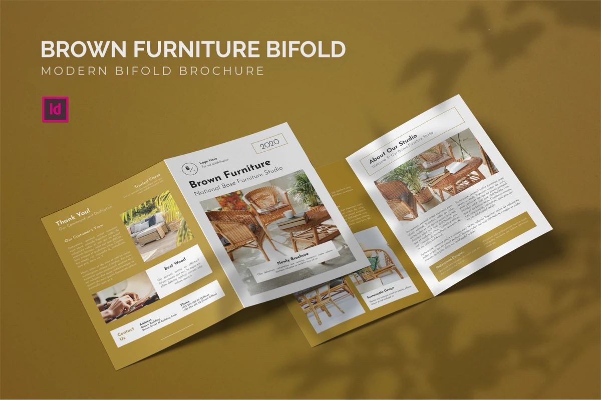 Brown Furniture - Bifold Brochure We present this Bifold Brochure for you, simple and very elegant, and this Bifold Brochure is suitable for all types of your business, made with adobe inDesign, very easy to customize, Hope you Like it, dont forget to rate, Thanks.