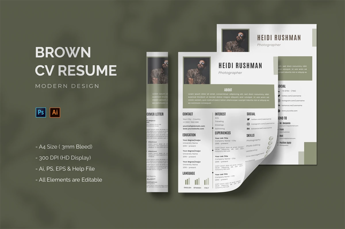 This is Brown Sunday - CV Resume Get it now!, CV Resume for All business and personal needs. Great for your business and this design will make your interested, elegant, and easily editable according to your needs (Adobe Illustrator,Adobe Photoshop). You can use this CV Resume for personal purpose, or company purpose, I hope you enjoy for this, Hope you Like it dont forget to rate, Thanks.