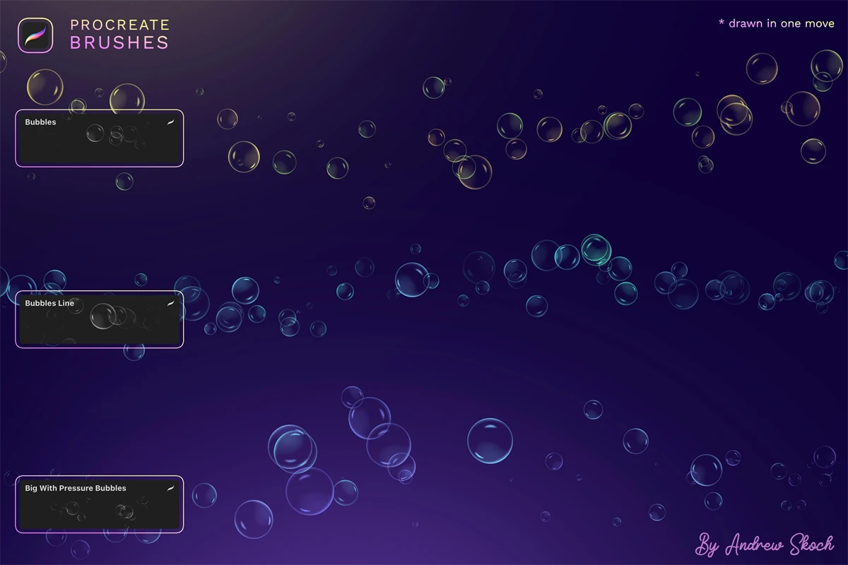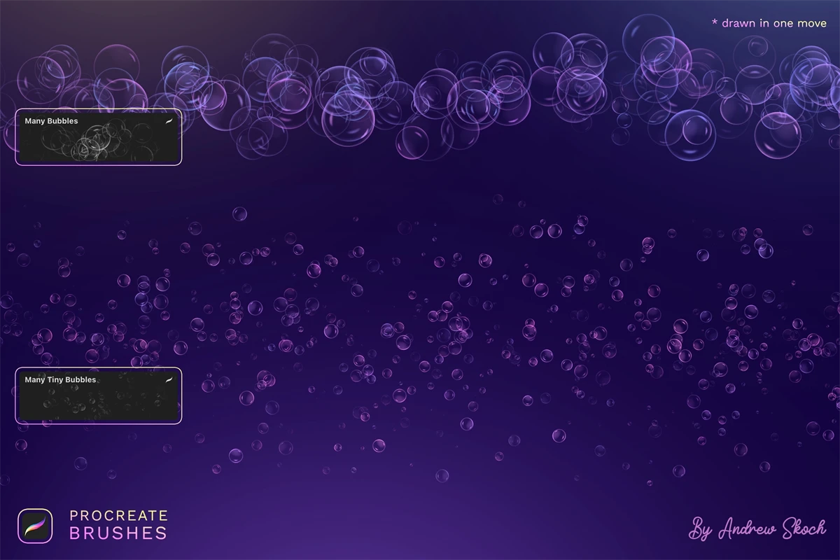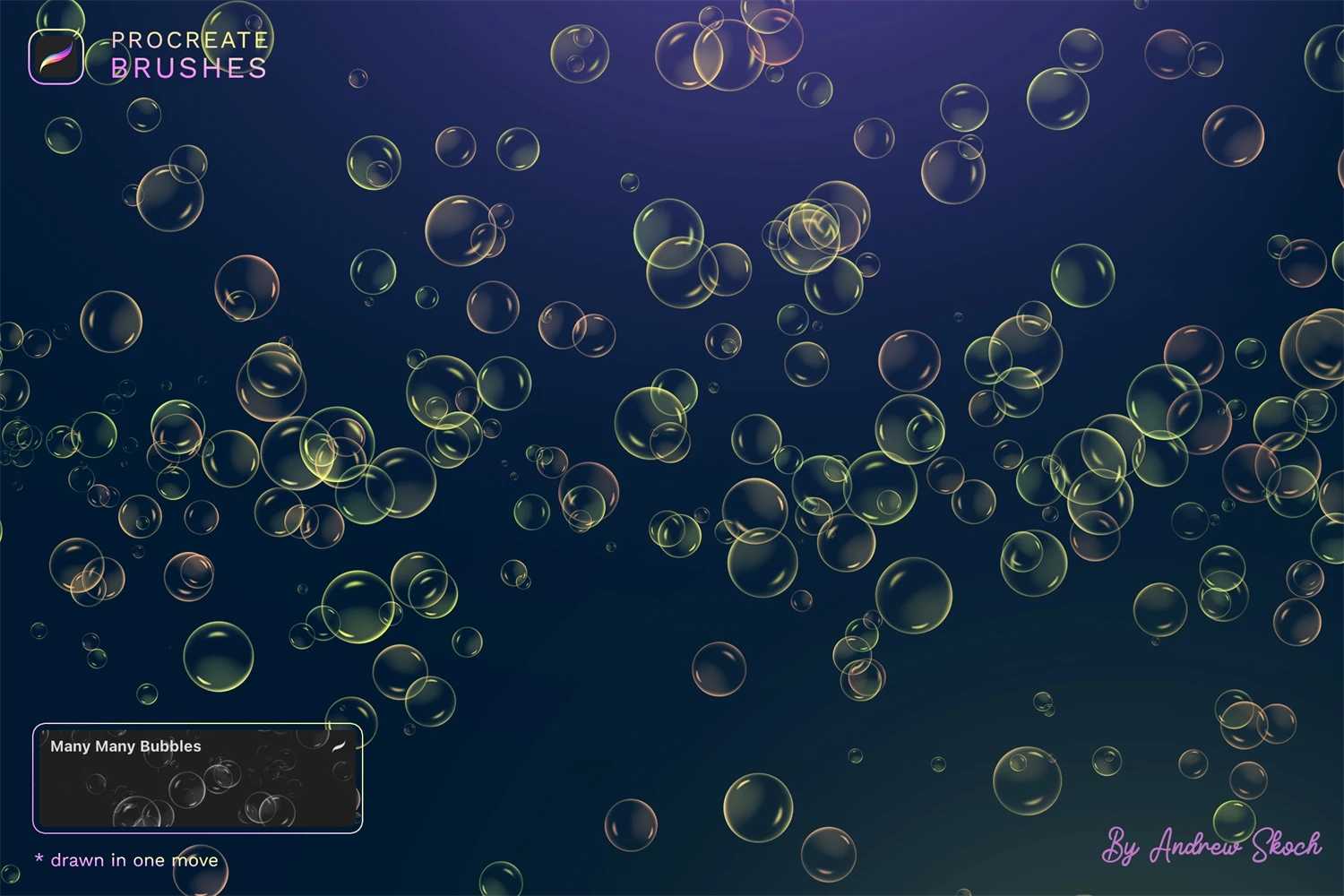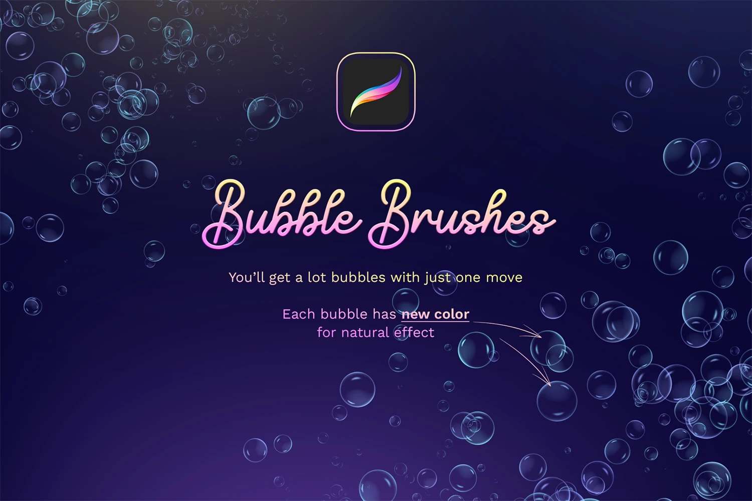 You'll get a lot bubbles with just one move. Each bubble has a new color for natural effect. Also single bubble brush draw colorful bubbles with several colors on each bubble.