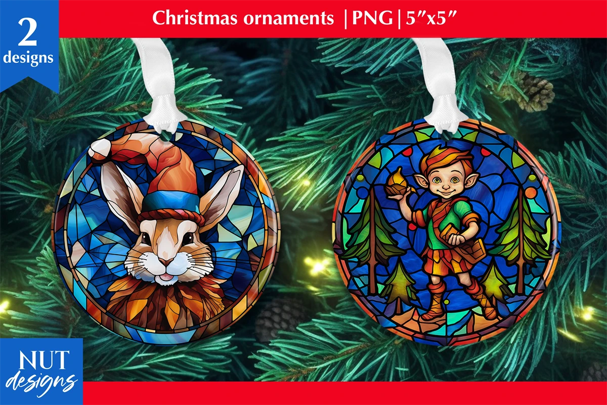 Bunny & Elf Stained glass Christmas ornament sublimation