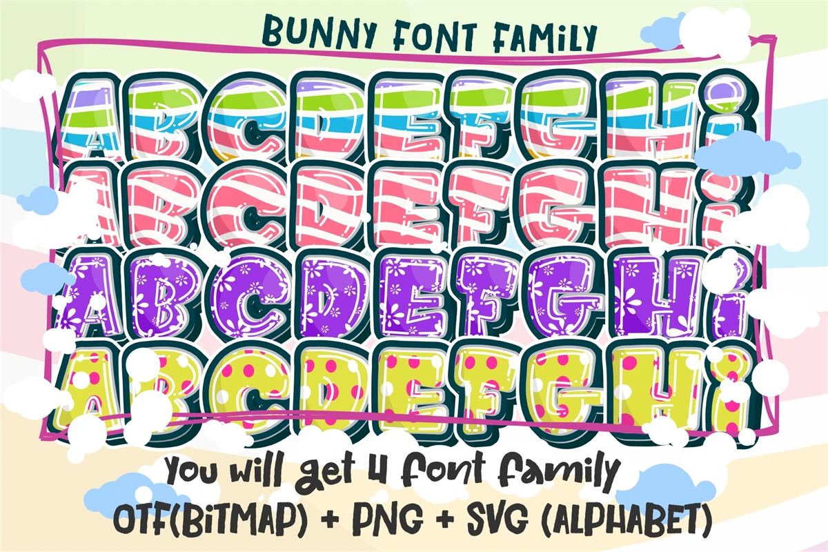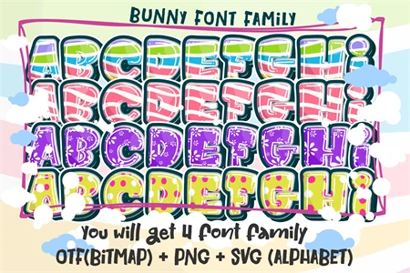 Bunny font is a delightful typeface capturing the essence of Easter and beyond. With whimsical strokes and adorable bunny-themed characters, its perfect for adding sweetness to designs. Whether for Easter cards, childrens books, or playful signage, Bunny font brings a smile to your creations.
