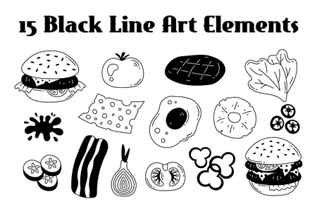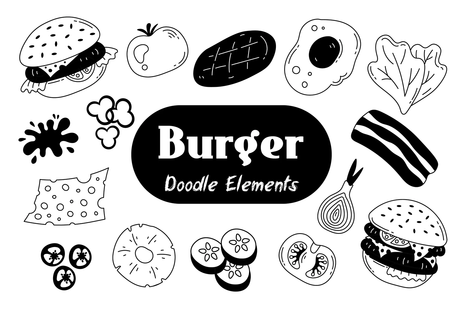 Burger with ingredients clipart in doodle style. Hamburger, cheeseburger, double burger, onion, cheese, lettuce, jalapeno, bacon, cucumber, meat, piece of pineapple, tomato, ketchup, bell pepper, fried egg black line art elements. American street food. Fast food vector illustration for restaurant, cafe, menu, delivery, surface, packaging or wrapping paper design.