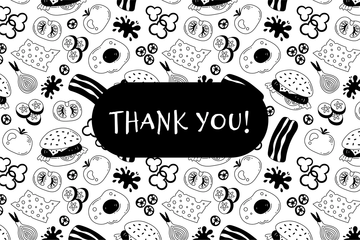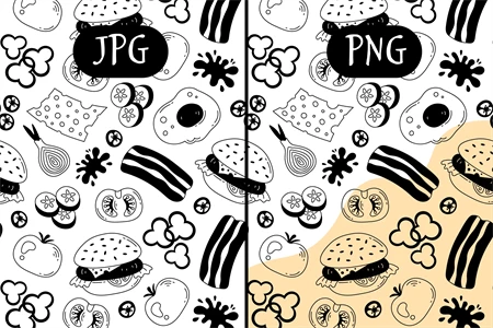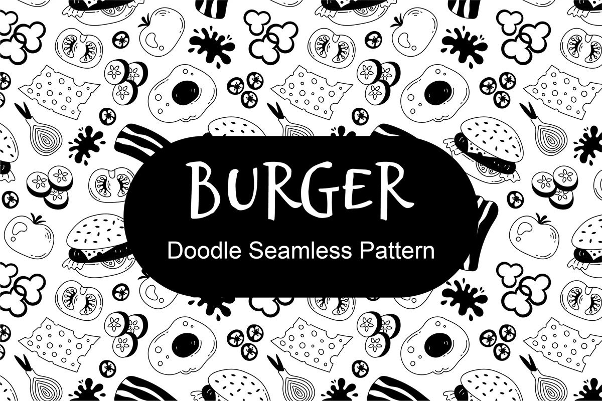 Food seamless pattern with burger and ingredients in trendy doodle style. Falling hand-drawn sketch elements. Street food, fast food theme for packaging, delivery, restaurant, cafe, kitchen, surface, wallpaper, product design. Black and white comic line art food seamless background.