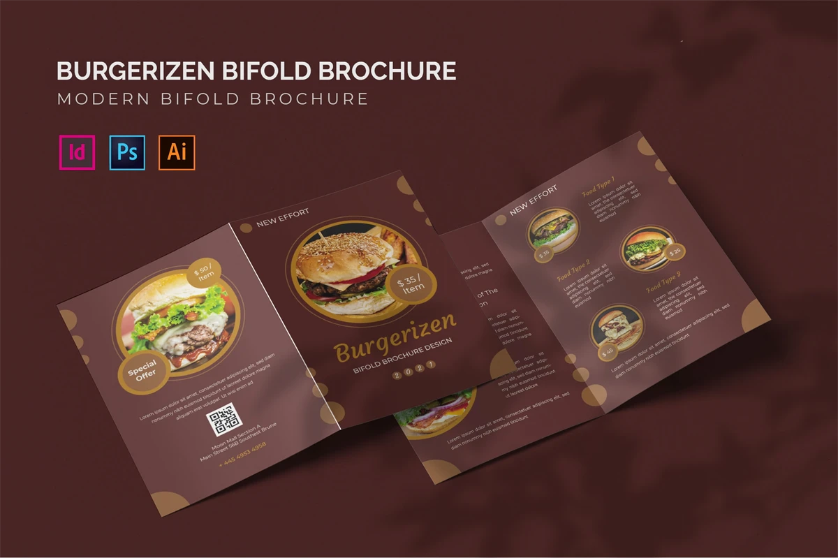 Burgerizen - Bifold Brochure We present this Bifold Brochure for you, simple and very elegant, and this Bifold Brochure is suitable for all types of your business, made with Adobe InDesign (INDD), Adobe Photoshop (PSD) and Adobe Illustrator (AI), very easy to customize, Hope you Like it, dont forget to rate, Thanks.