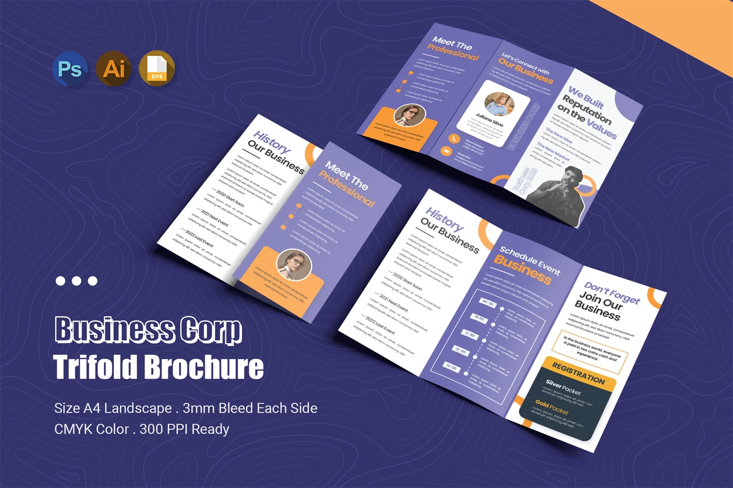This trifold brochure design template offers an array of content, making it the perfect platform for showcasing your company, item, or occasion. Each panel reveals a different aspect of your story with its thoughtful layout and visually appealing elements.