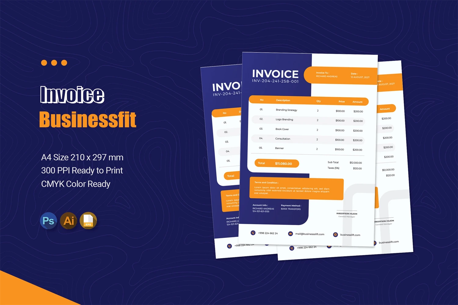 Use our invoices to make your bookkeeping easier and to impress your clients with an invoice display that has a modern, elegant design and strong typography. This invoice template is easy to use and customizable, making it perfect for any medium.