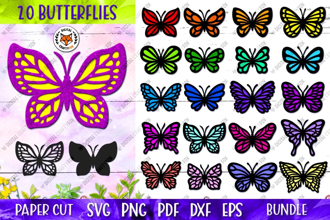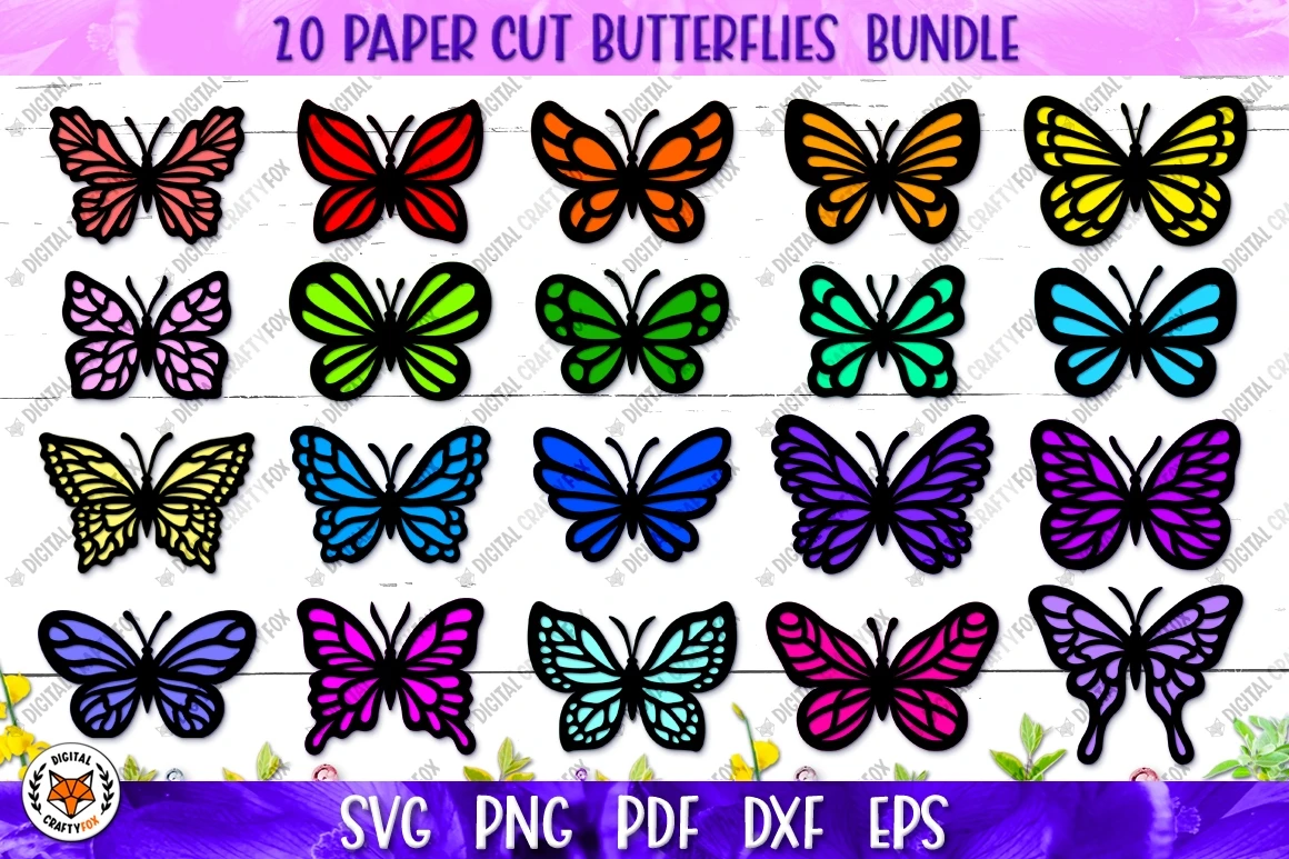 20 paper cut butterflies. 2d layered butterflies. For paper and laser cutting or sublimation.
