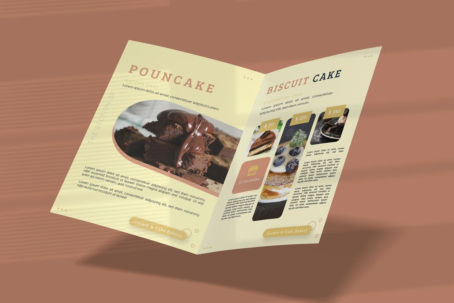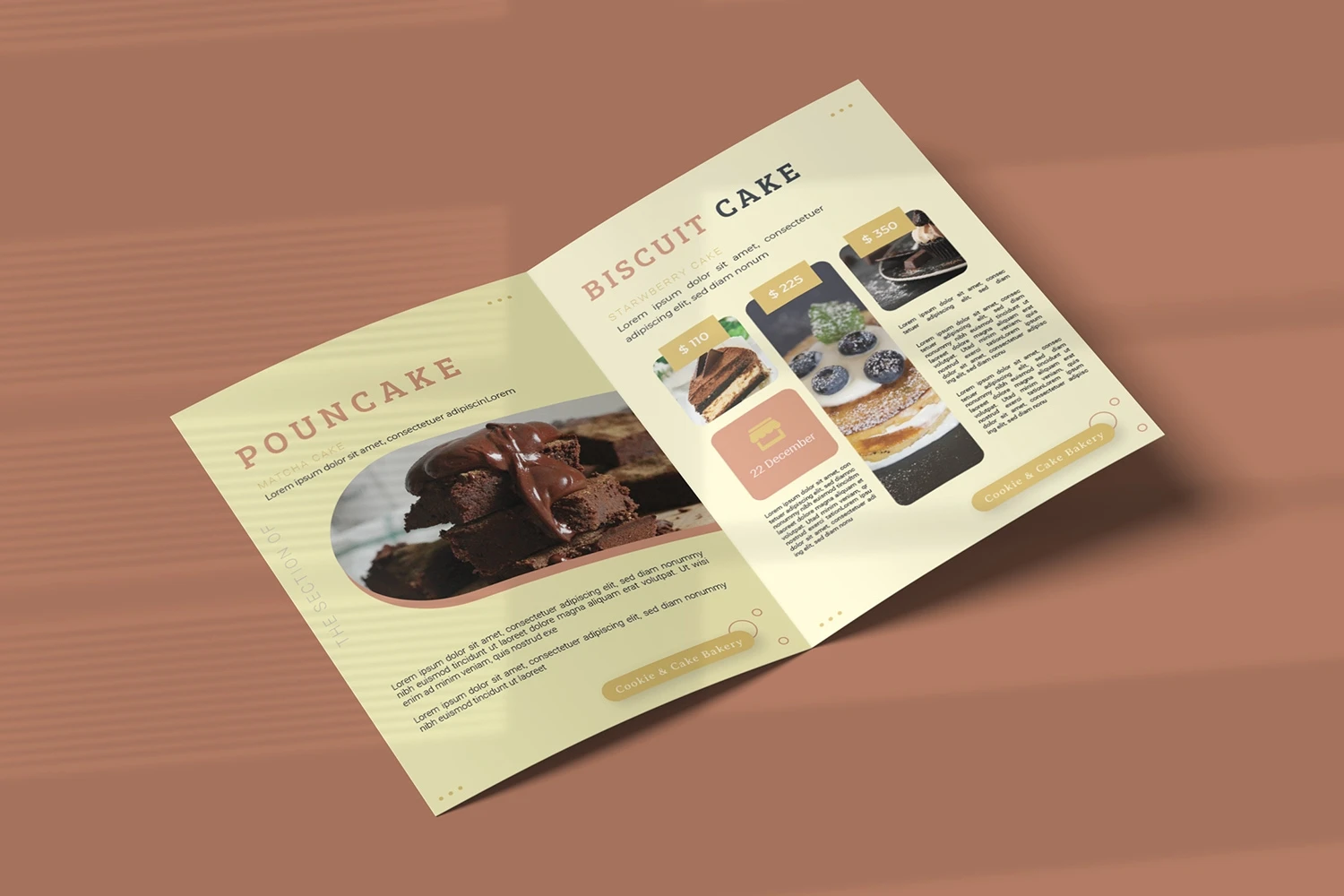 Cakes Creamy - Bifold Brochure We present this Bifold Brochure for you, simple and very elegant, and this Bifold Brochure is suitable for all types of your business, made with Adobe InDesign (INDD), Adobe Photoshop (PSD) and Adobe Illustrator (AI), very easy to customize, Hope you Like it, dont forget to rate, Thanks.