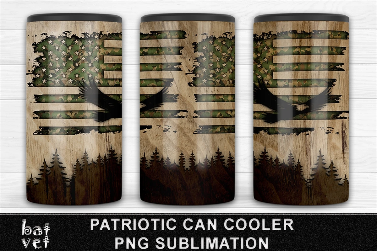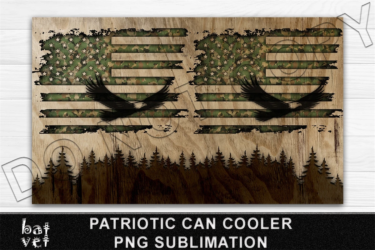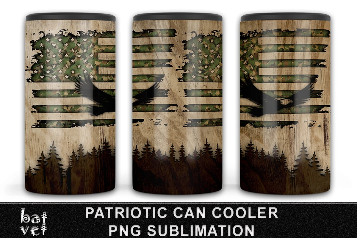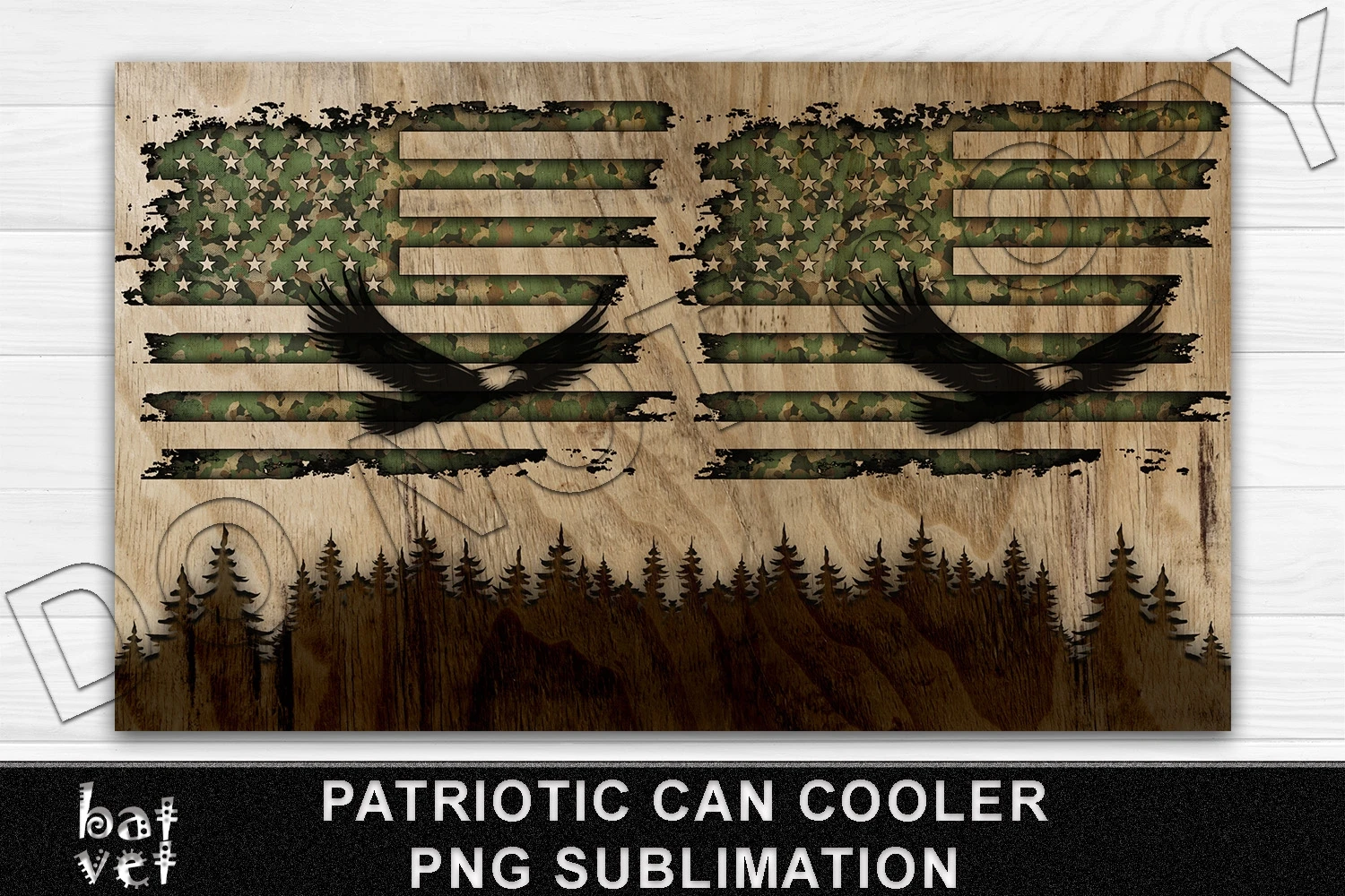 Can Cooler PNG, Patriotic, Distressed USA Flag, Wood, Bald Eagle, Forest Sublimation.