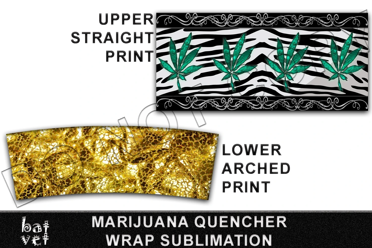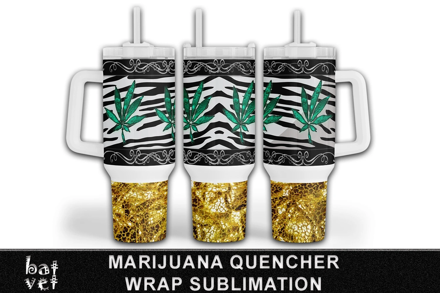Halloween Tumbler 40 Oz Quencher Cannabis, Zebra, Gold, 420 Sublimation Wrap. Two Part Sublimation - Upper Straight and Lower Arched Print.