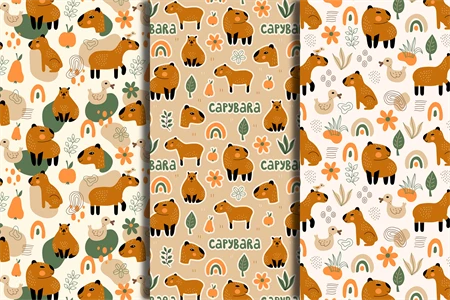 Trendy exotic animal seamless patterns with capybara and doodle organic shapes. 3 Childish seamless backgrounds with abstract natural elements, scribbles and squiggles in flat style. Cozy tropical animal design with flowers and leaves. Capybara digital papers. Repeat vector illustration.