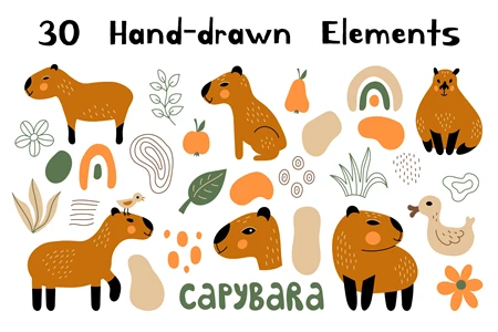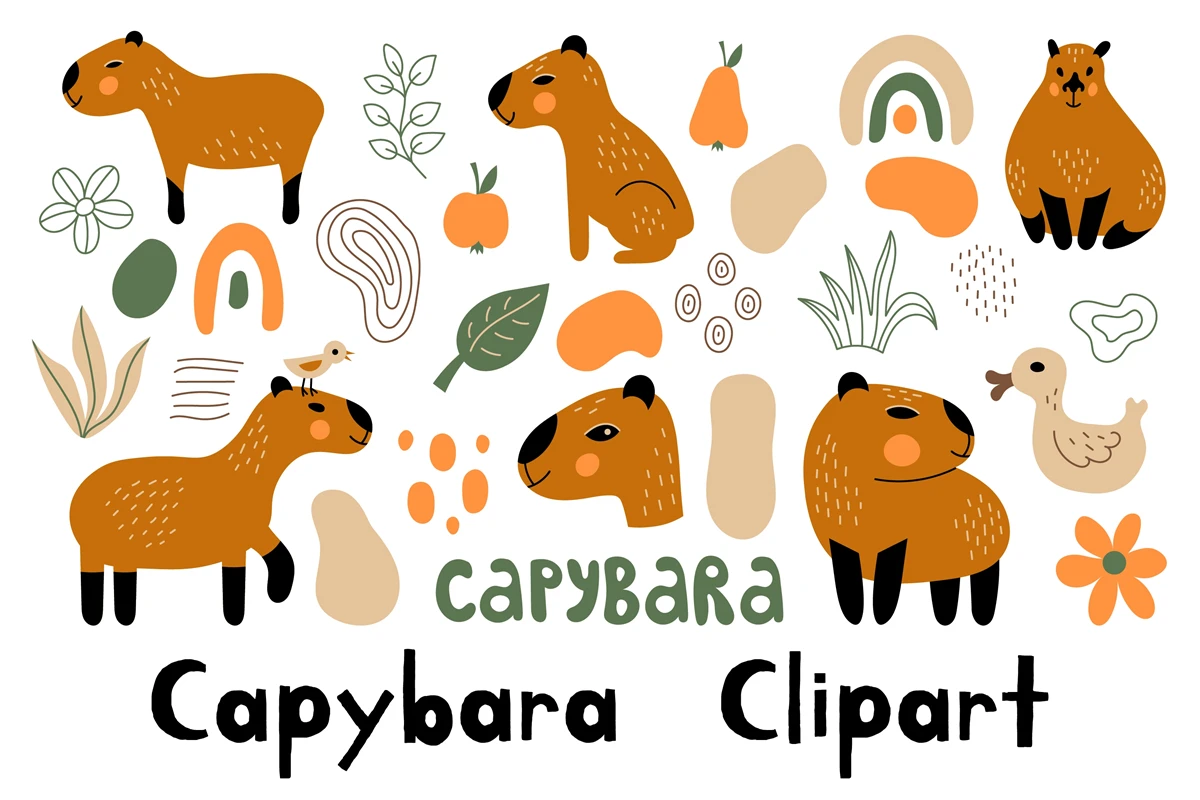 Capybara clipart with natural organic shapes in trendy minimal Scandinavian style. Decorative South American wildlife animal hand-drawn illustrations with doodles. Funny capybara elements for kids, t-shirt prints, mug, baby, nursery, frame art, poster, greeting card, etc.