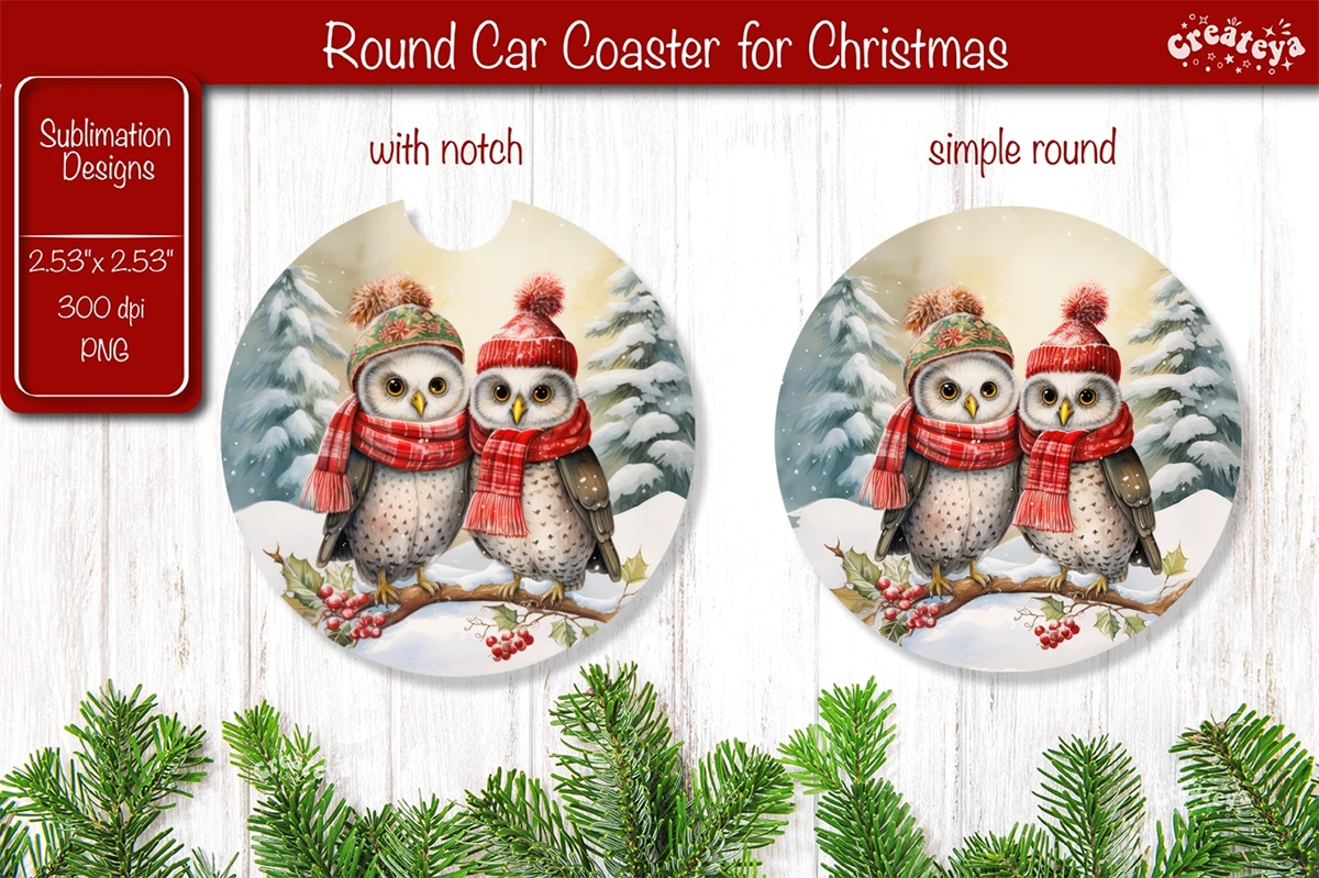 Car coaster Coaster Christmas Sublimation with cute Christmas Owl PNG. This car coaster 2.53'' x 2,53'' is more than just a way to protect your table it brings a touch of snow-filled charm and a warm, fuzzy feeling to your home decor.