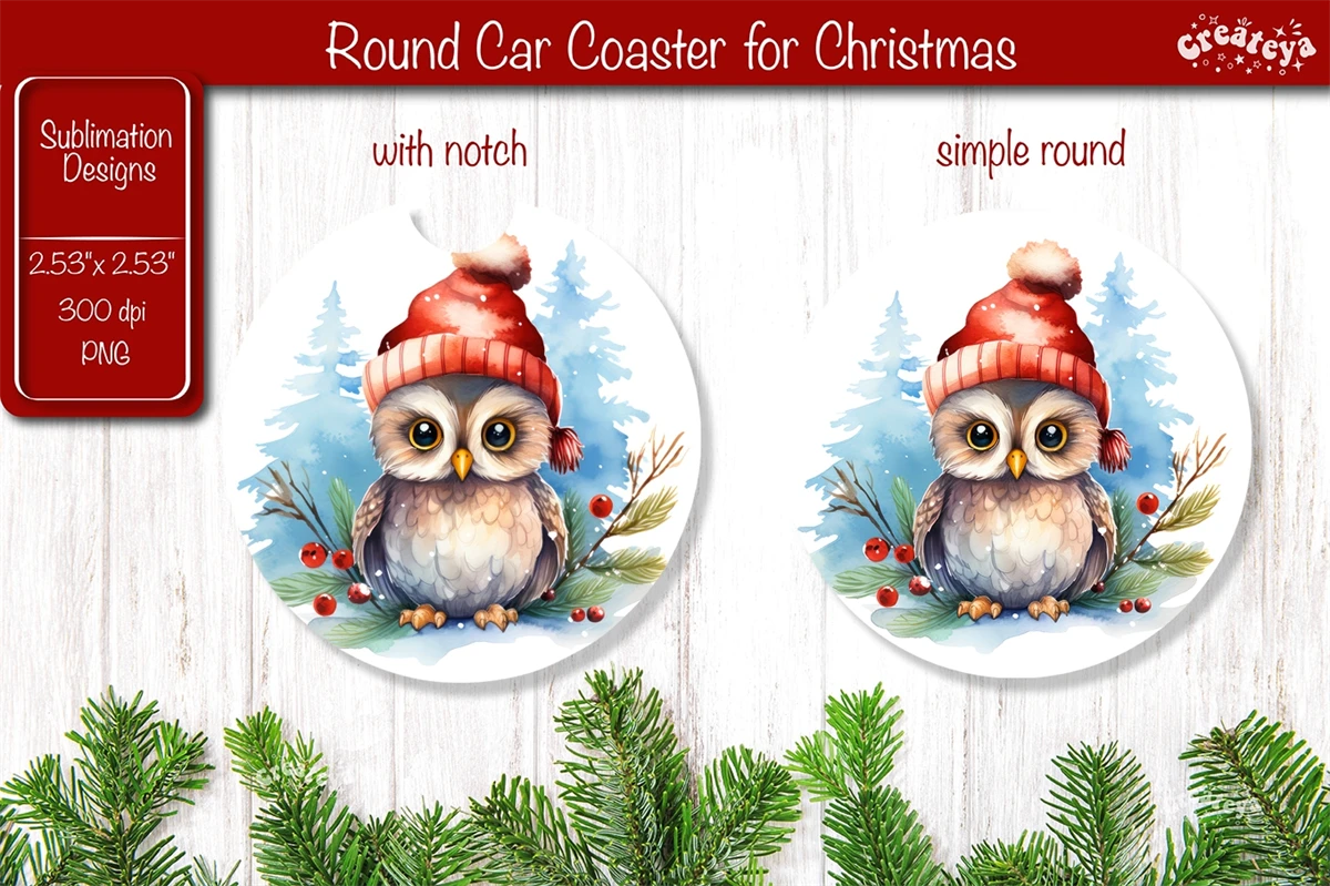 Car coaster Coaster Christmas Sublimation with cute Christmas Owl PNG. This car coaster 2.53'' x 2,53'' is more than just a way to protect your table it brings a touch of snow-filled charm and a warm, fuzzy feeling to your home decor.