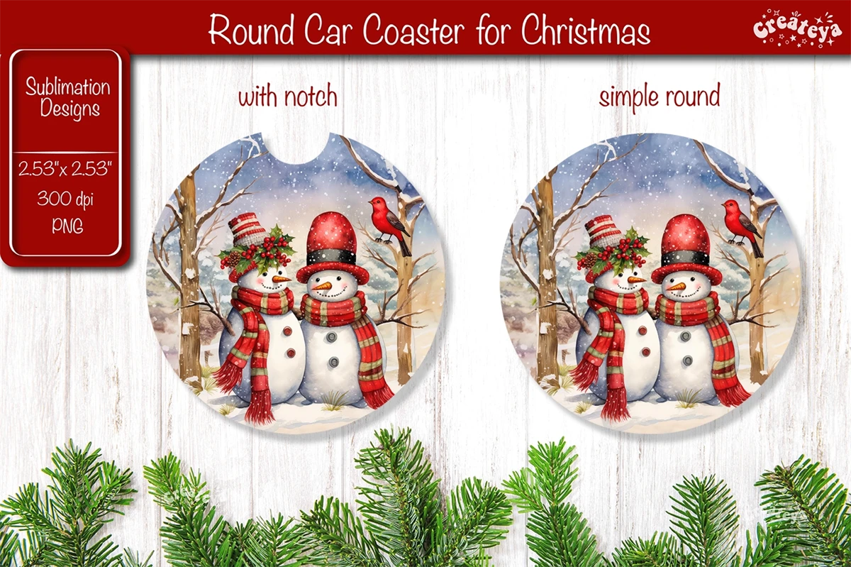 Car coaster Coaster Christmas Sublimation with cute Christmas Snowman PNG. This car coaster 2.53'' x 2,53'' is more than just a way to protect your table it brings a touch of snow-filled charm and a warm, fuzzy feeling to your home decor.