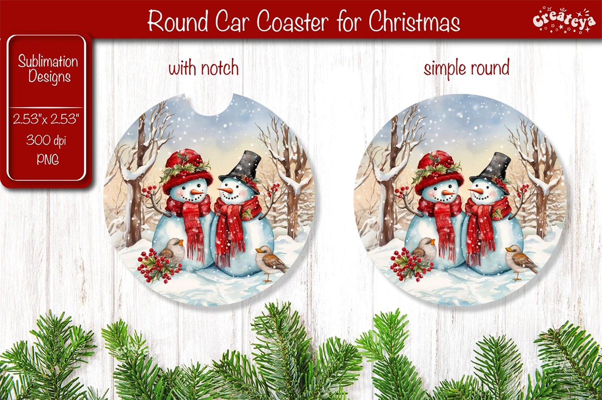 Car coaster Coaster Christmas Sublimation with cute Christmas Snowman PNG. This car coaster 2.53'' x 2,53'' is more than just a way to protect your table it brings a touch of snow-filled charm and a warm, fuzzy feeling to your home decor.