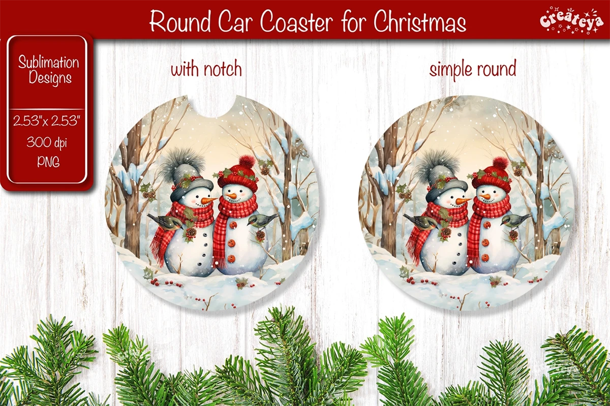 Car Coaster Christmas Sublimation Round Snowman Watercolor