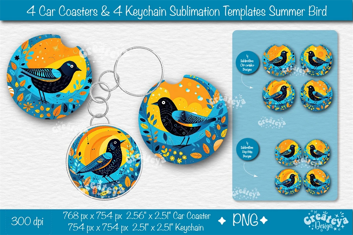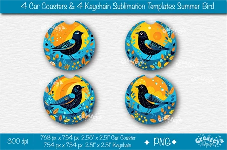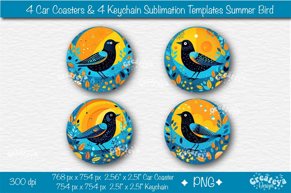 Car coaster Sublimation Bundle, Round Keychain Sublimation with bright Sublimation Summer Bird PNG template. This sublimation bundle PNG contains 8 template designs.
