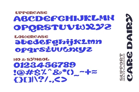Care Dairy is a cute and fun display font with an original comic style. Use these display fonts to add to your design library in an easy way to find custom comic display variations on any design idea you can think of!