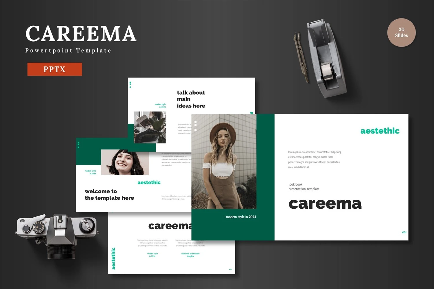 This is **Careema - Powerpoint Template** - Get it now! Powerpoint Slides is a great template ready to use. Clean, scalable, colorful, and multipurpose. Suitable for Business, Pitch Deck, E-commerce, or Product promotion purposes.