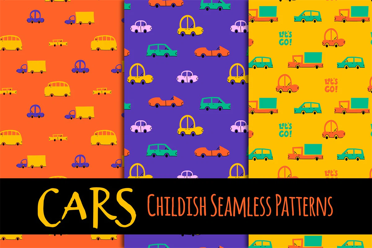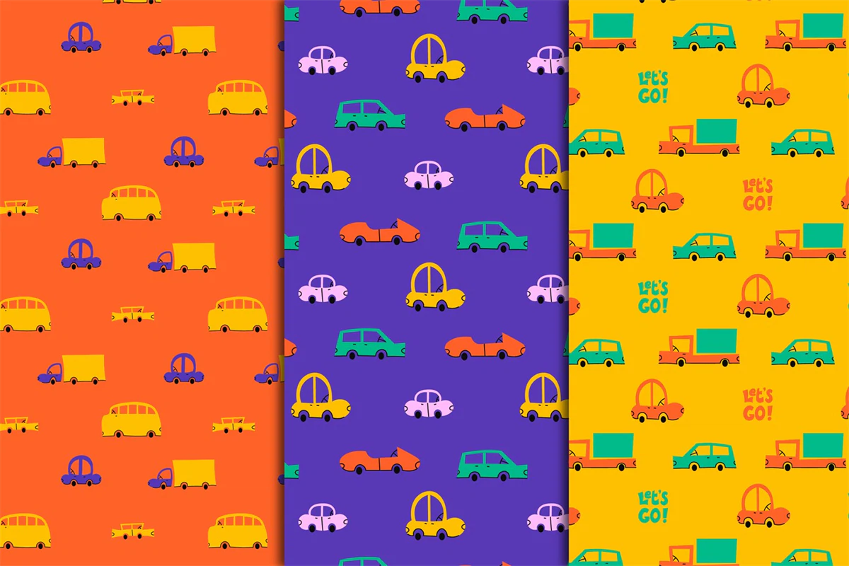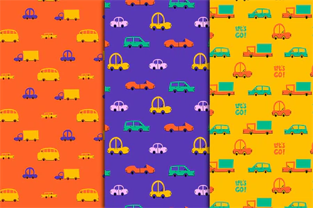 3 cute colorful childish seamless patterns, digital papers and endless backgrounds with various vehicles, automobile, bus, sport car in minimal hand-drawn cartoon style are perfect for little boys, drivers, fabric, textile, nursery, wallpaper, surface design, greeting card, business card, accessories, transportation, logistic companies, etc.