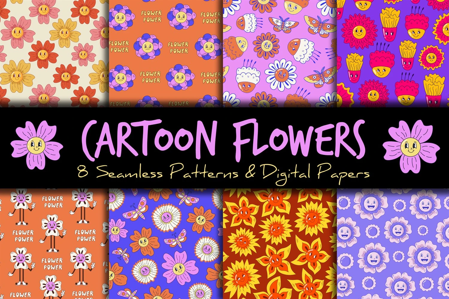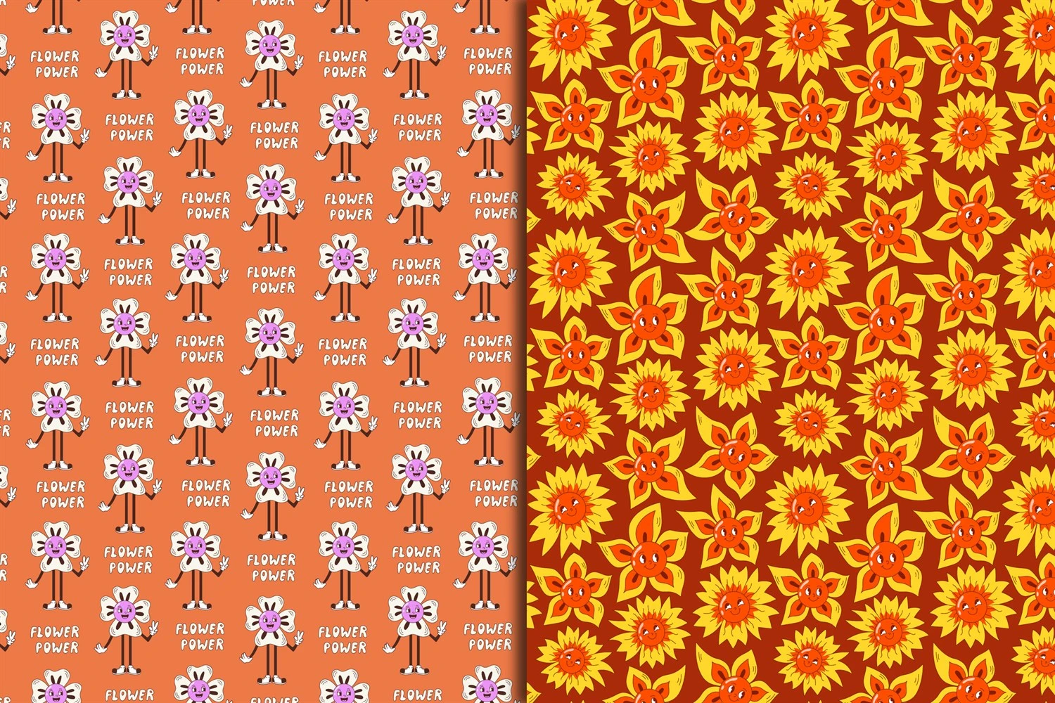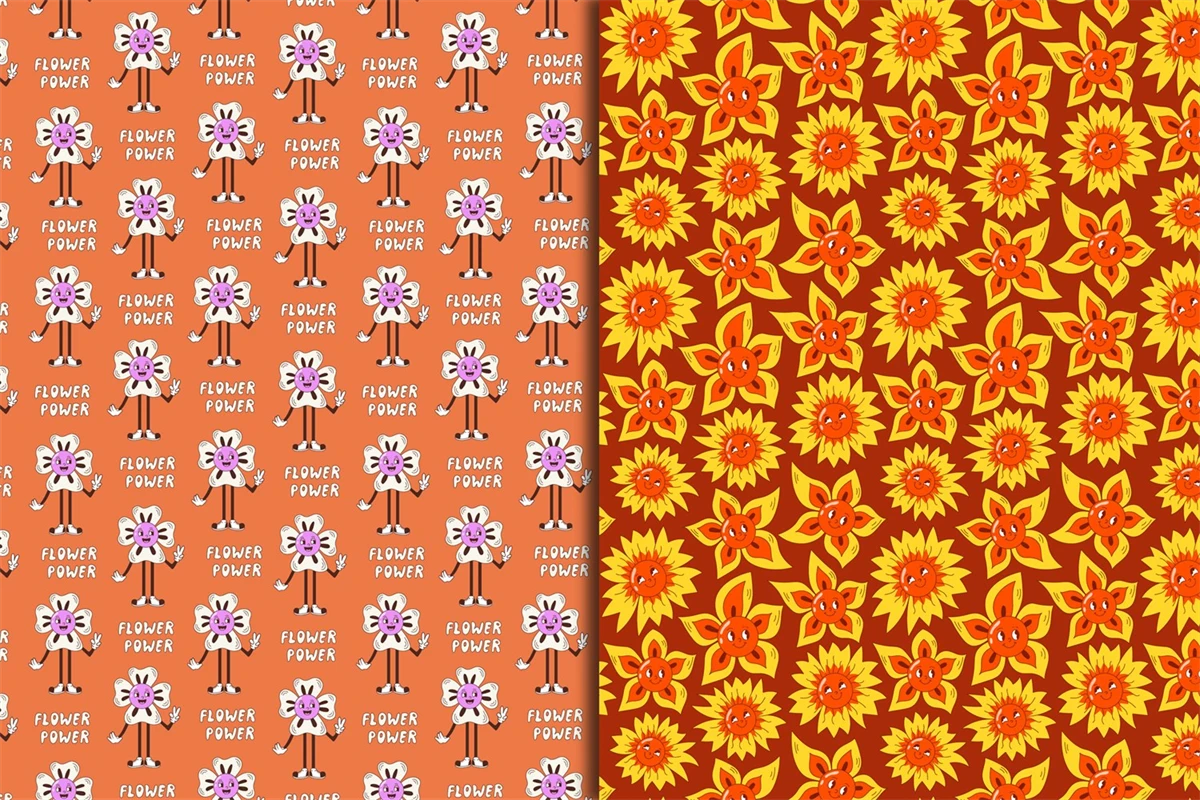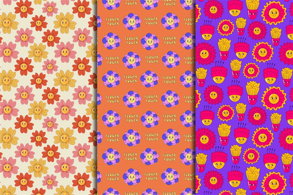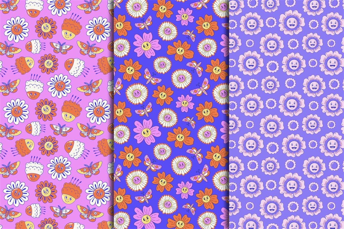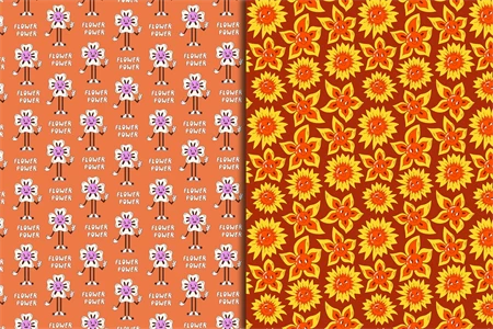 Funny and cute seamless patterns, digital papers and endless backgrounds with trendy smiley flowers. Cartoon retro style bright floral characters are perfect for kids, summer decoration, scrapbooking, card making, textile, fabric, wrapping paper, apparel, wallpaper, accessory, wallpaper, surface design. Vivid colored positive vintage aesthetics. Daisy and chamomile smiling face.