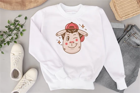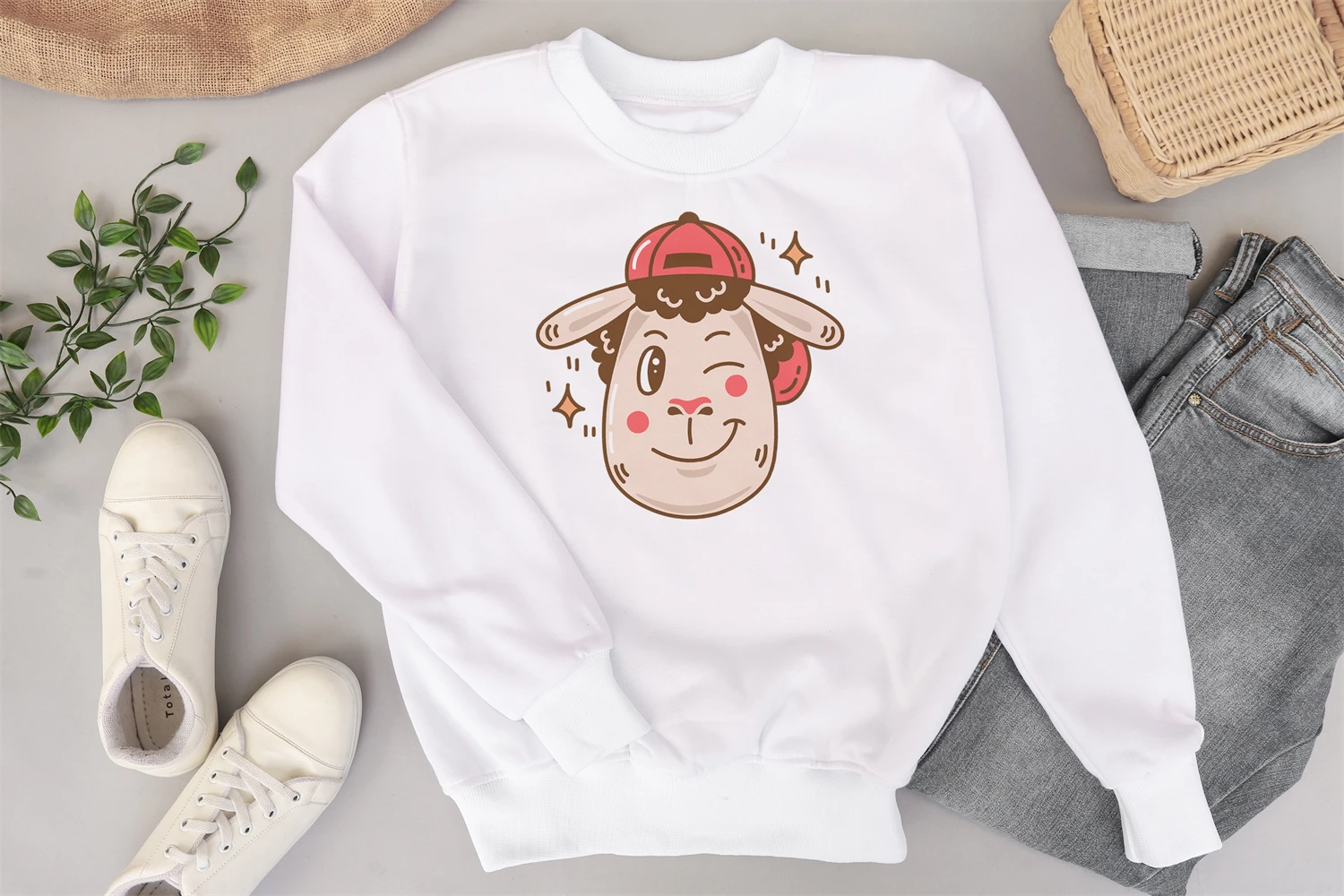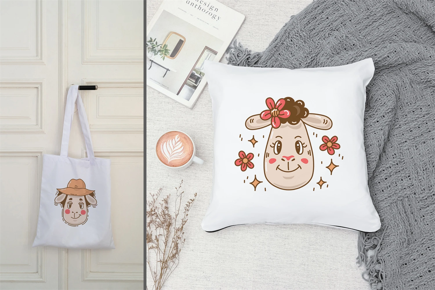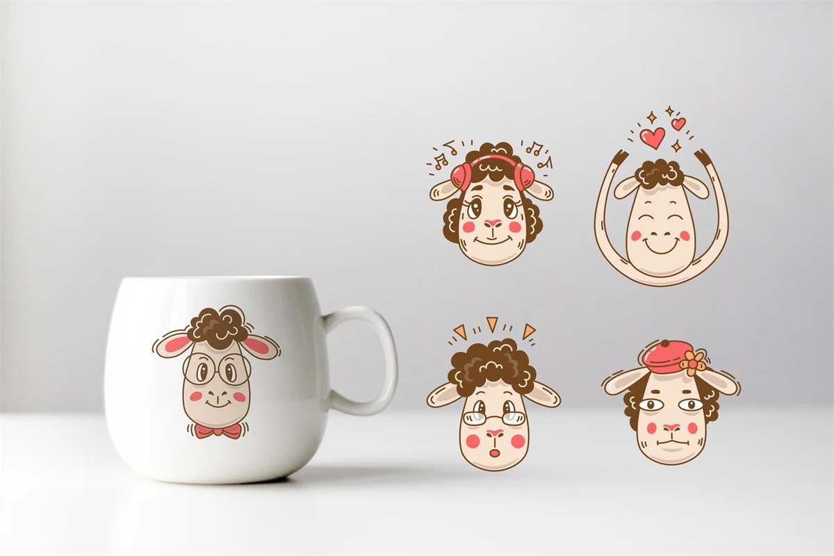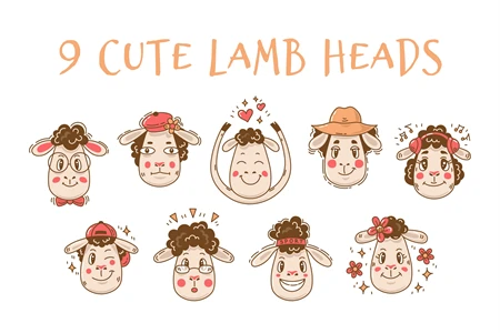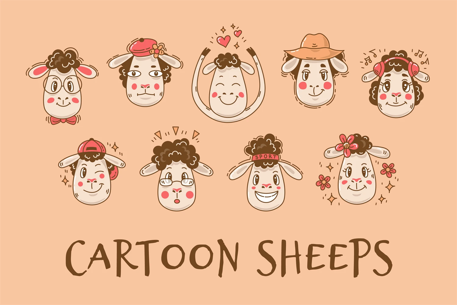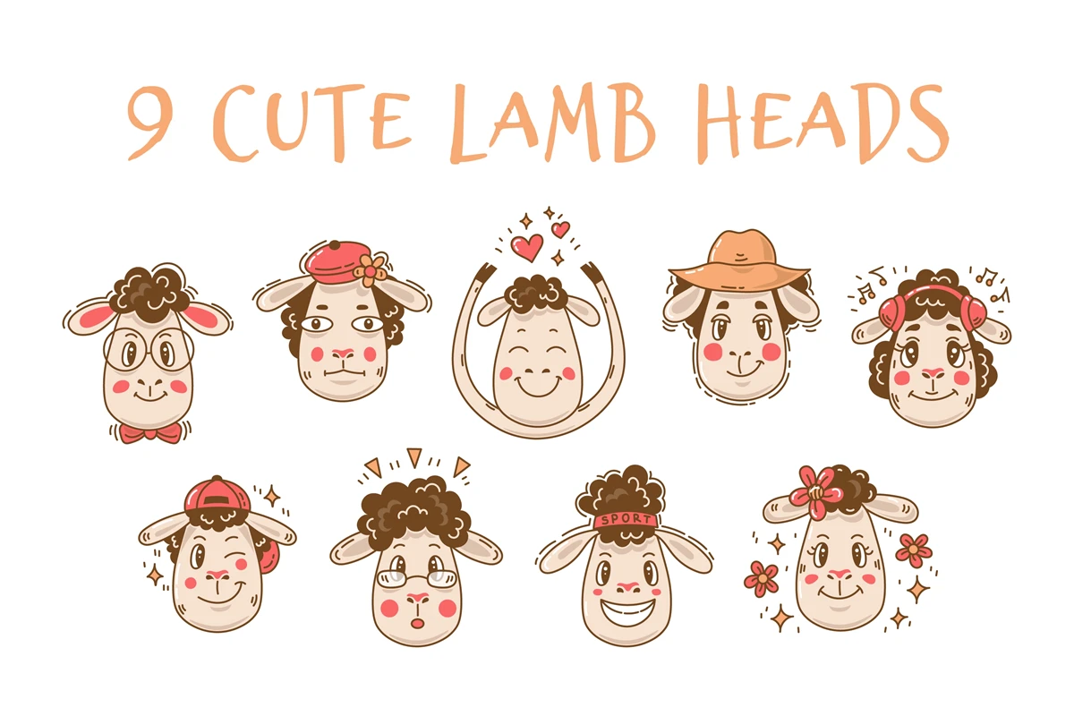 Funny and cute cartoon sheep characters. Animal heads for t-shirt prints, kids, stickers. Vector illustration. Lamb emoticons collection.