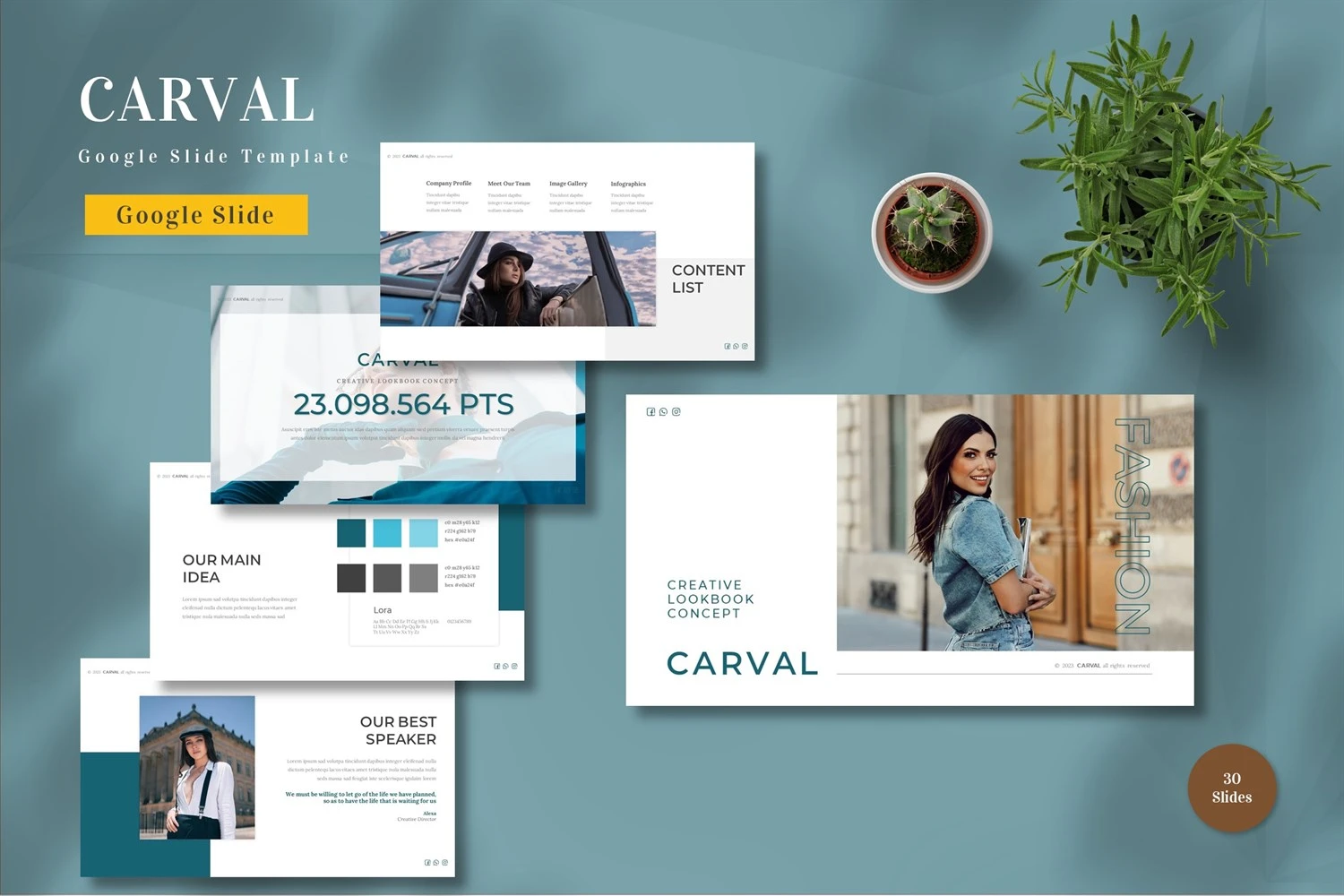 Get it now! **Carval - Google Slide Template** for All Business and Personal Needs All elements on this template are editable; input your content, replace your image with a placeholder, change the color, and all presentations include an animated slide to present your slides.