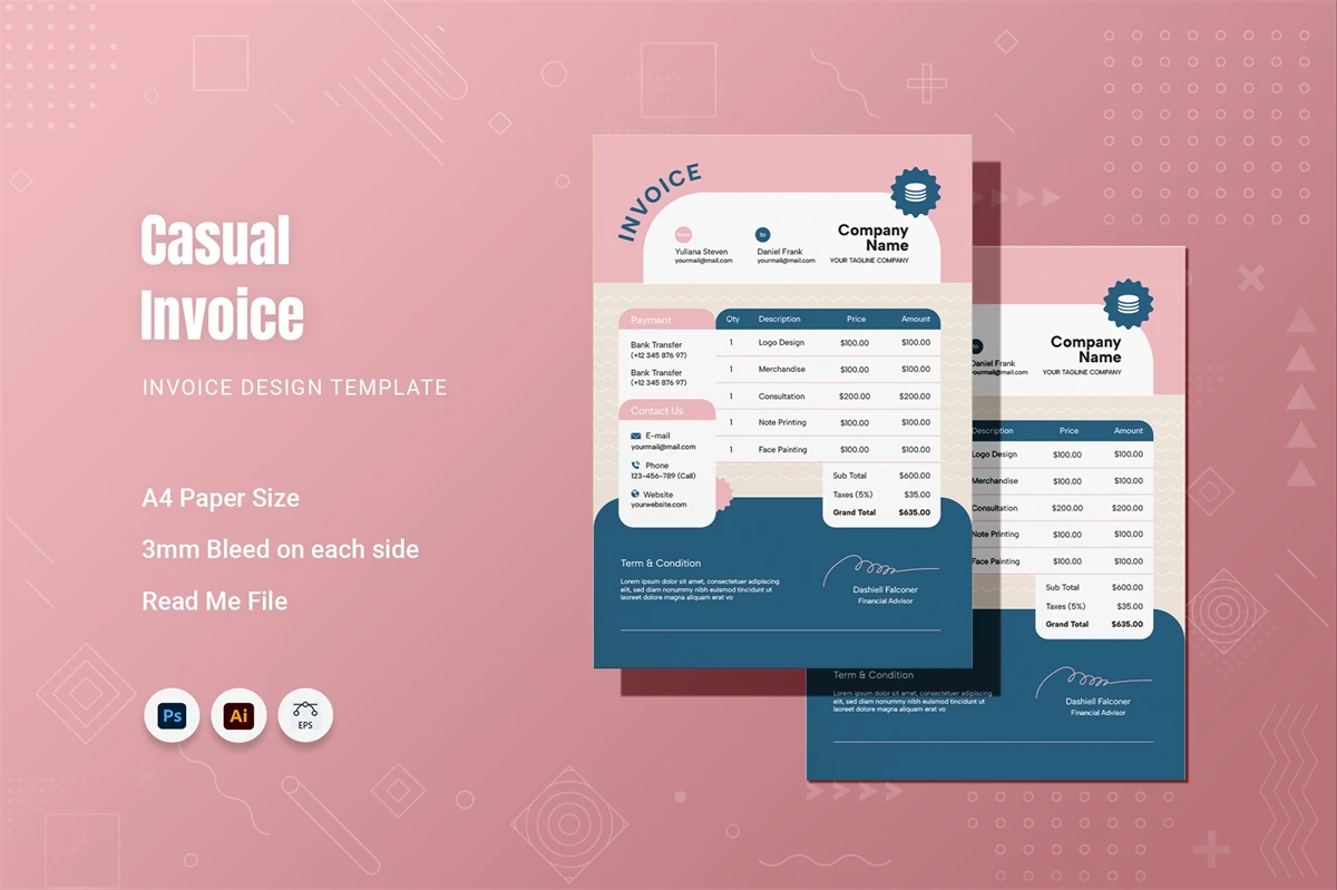 Each and every aspect holds significance within the realm of corporate affairs. Our invoice design template is poised to professionally showcase your brand. Your invoices will exude both style and practicality.