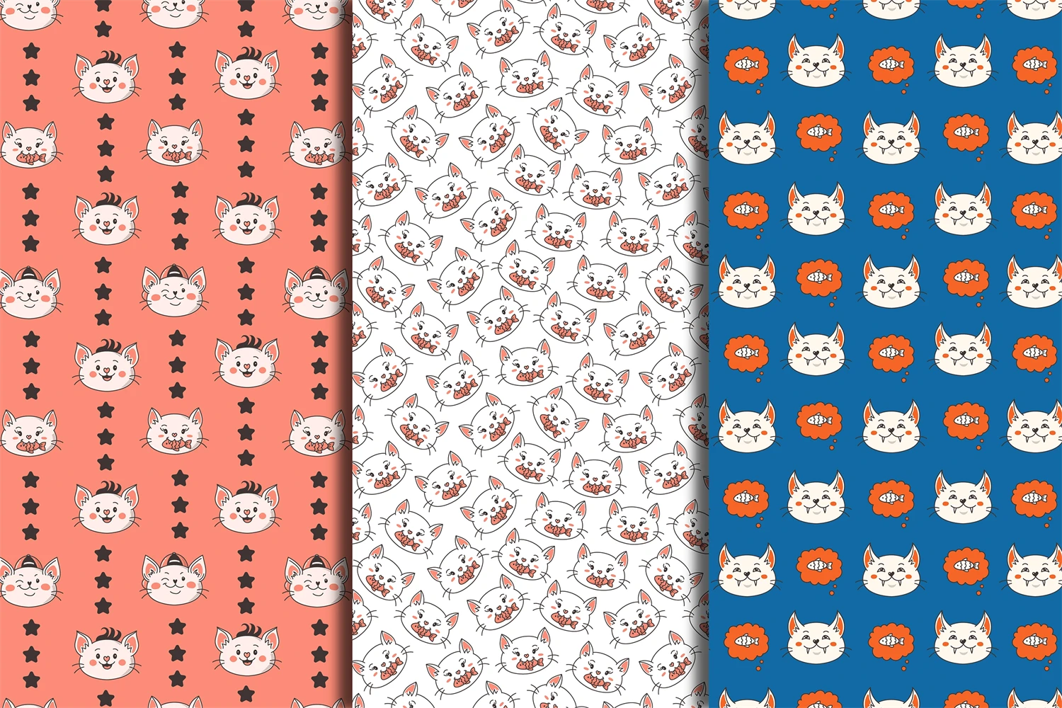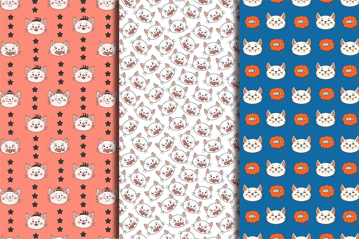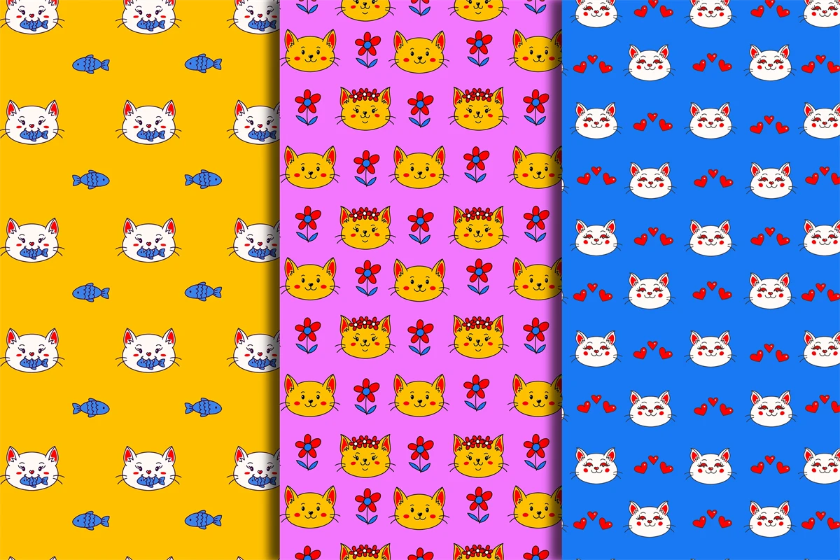 Funny colorful pet seamless patterns with cute comic cats. Whimsical vibrant seamless backgrounds with quirky cartoon kittens. Adorable cat digital papers. Repeat vector illustration for pets, fabric, textile, greeting card, kids, wallpaper, surface design, etc.
