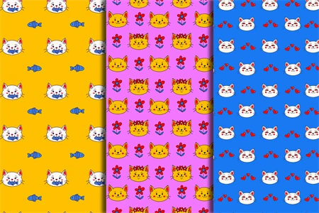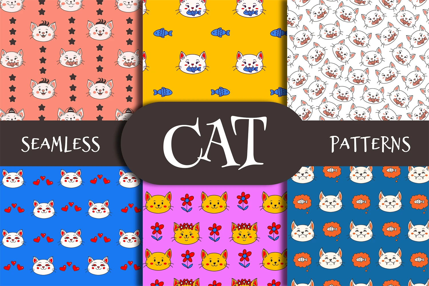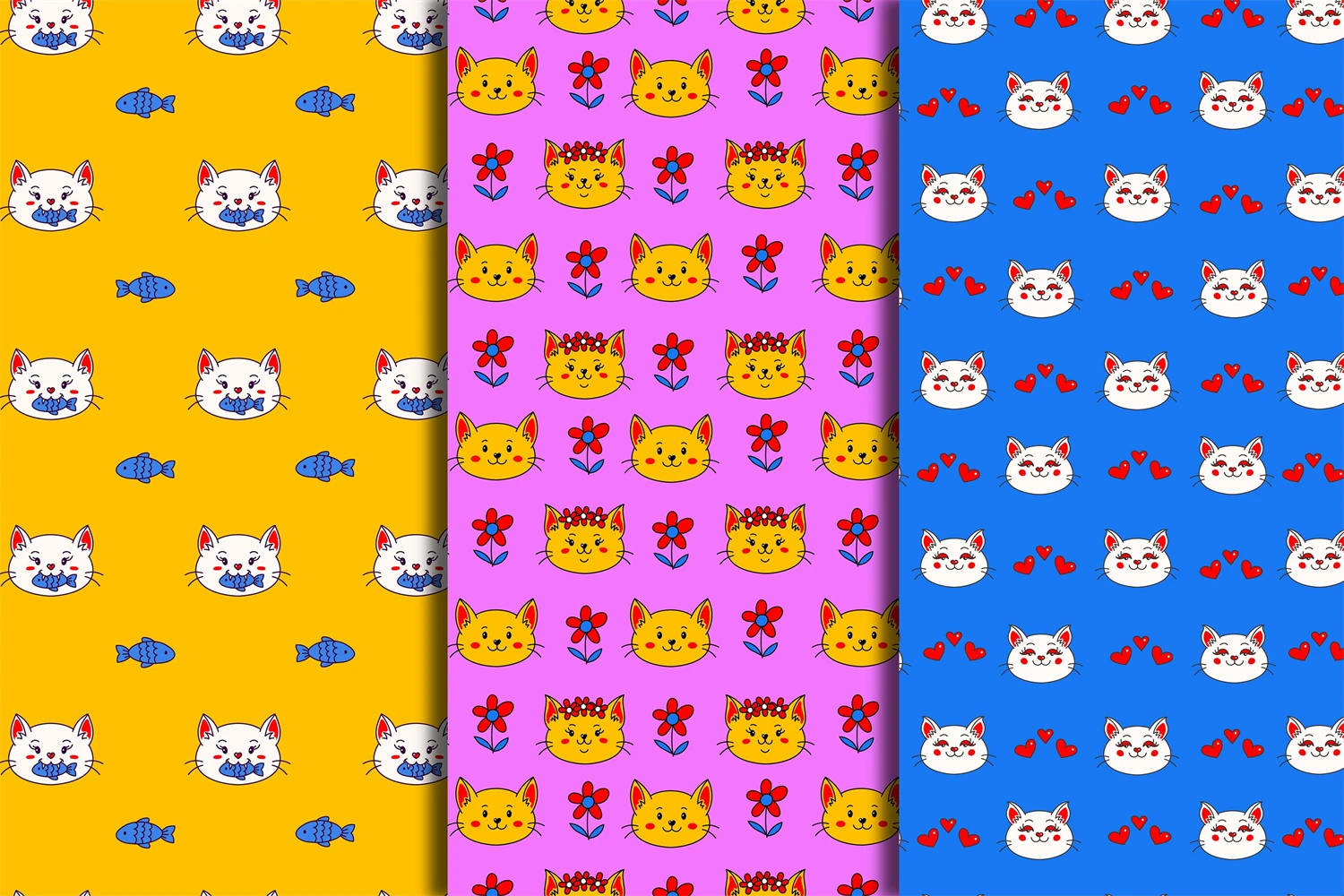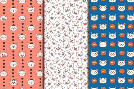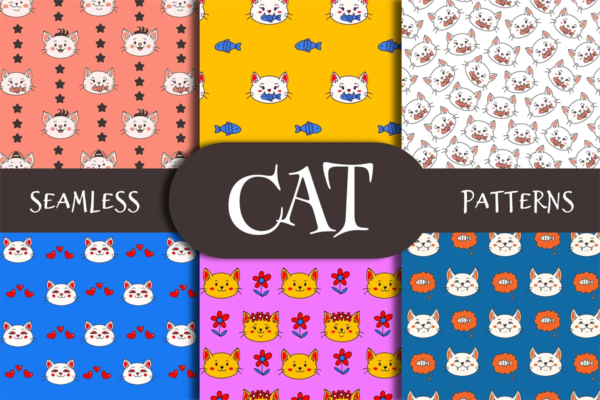 Funny colorful pet seamless patterns with cute comic cats. Whimsical vibrant seamless backgrounds with quirky cartoon kittens. Adorable cat digital papers. Repeat vector illustration for pets, fabric, textile, greeting card, kids, wallpaper, surface design, etc.