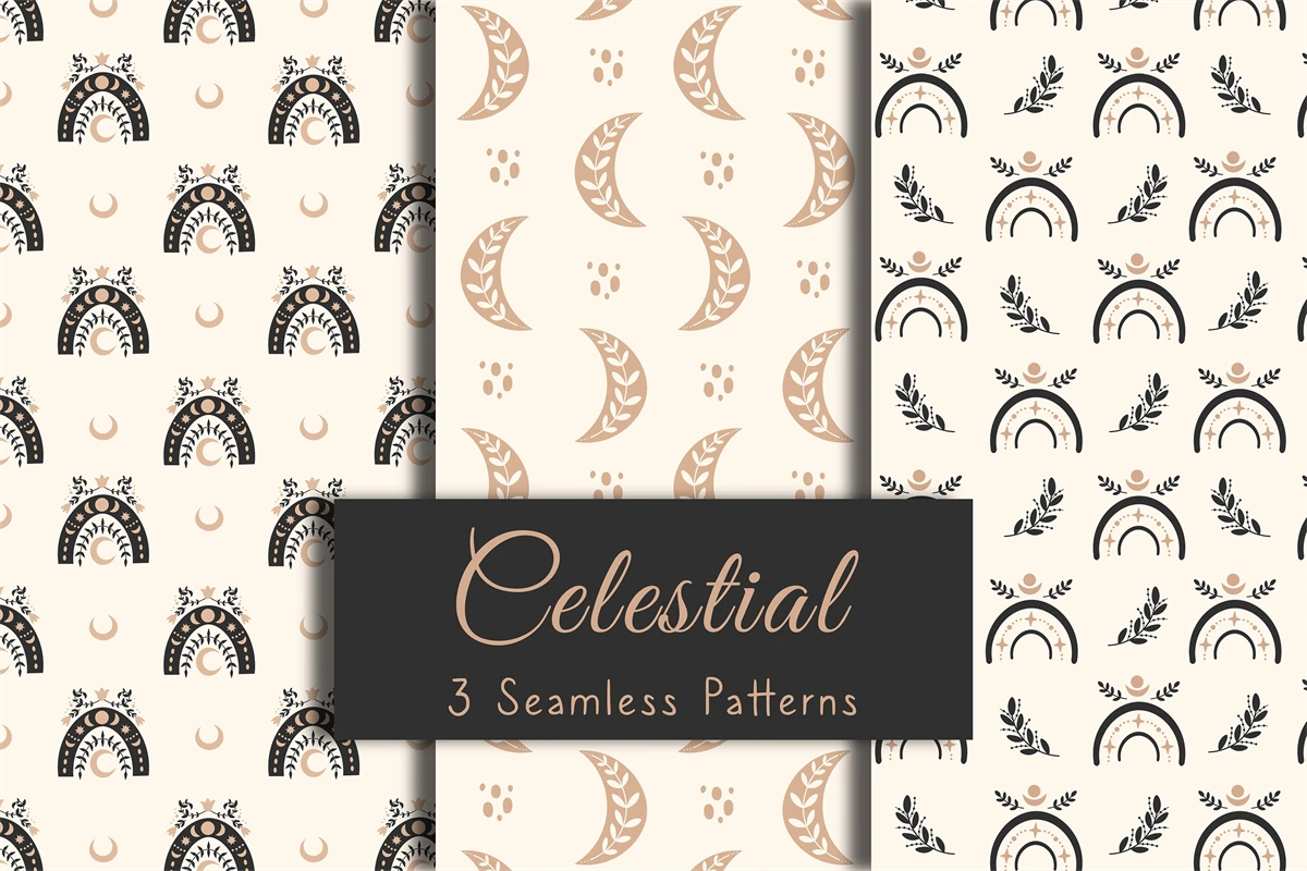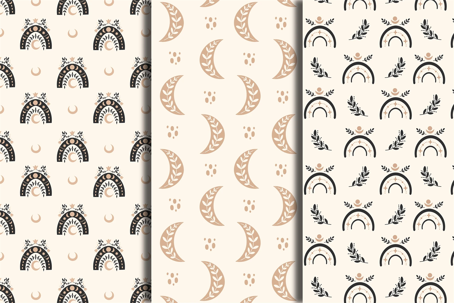 Elegant mystical seamless patterns collection with rainbow, moon, crescent, stars, branches, twigs. Magical ornaments with black, beige and gold colors. Esoteric backgrounds for wrapping paper, patch work, fabric, textile, wallpaper, greeting card, etc. Spiritual, astrology, occult design with nature elements on beige background.