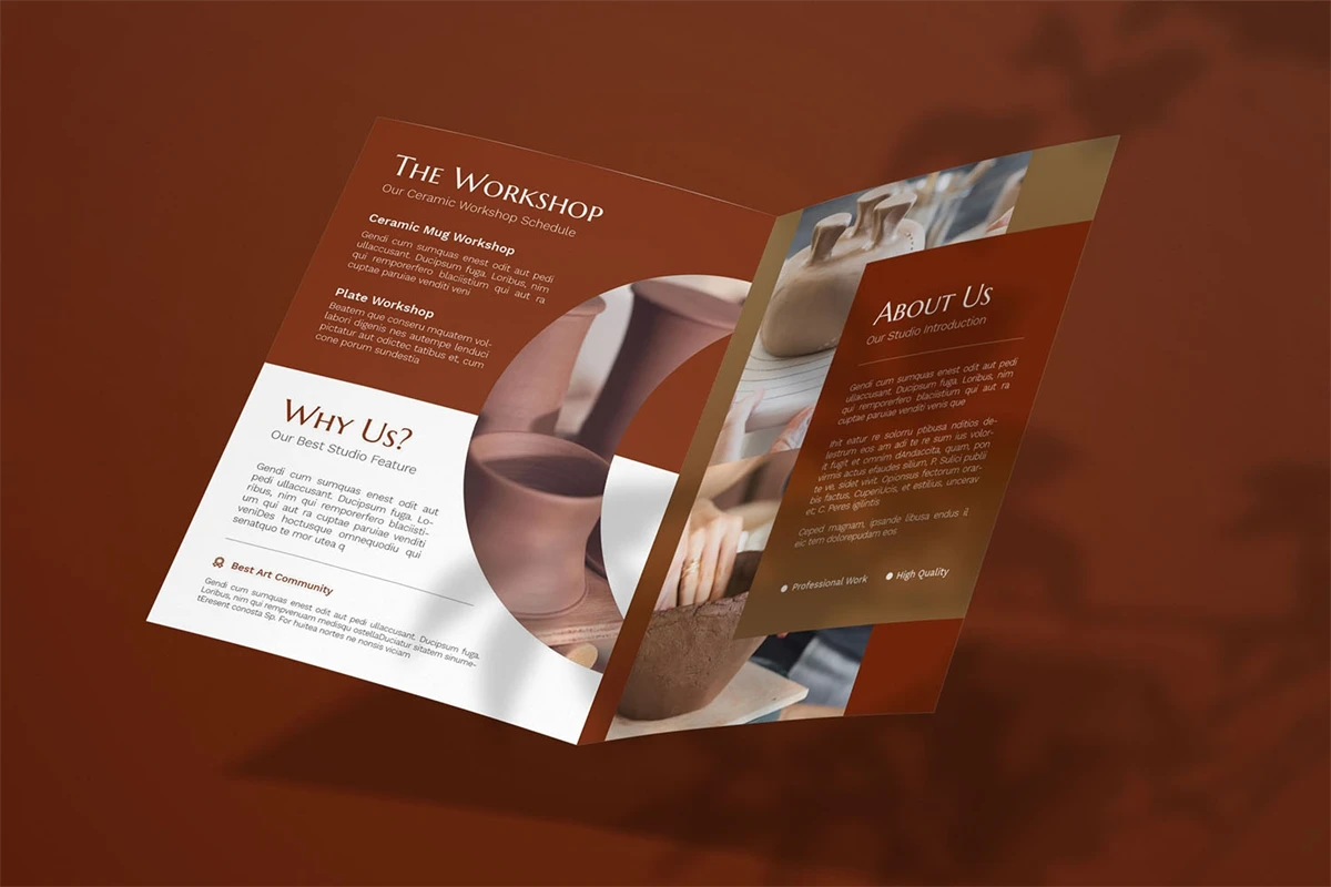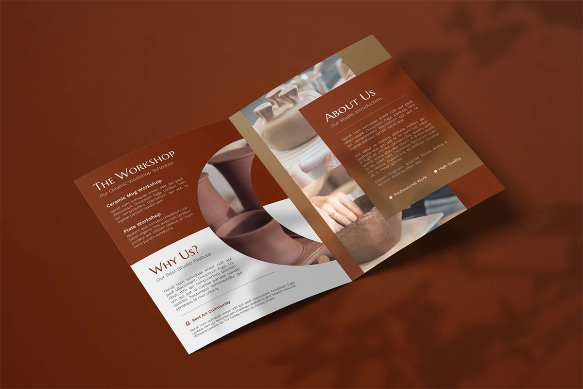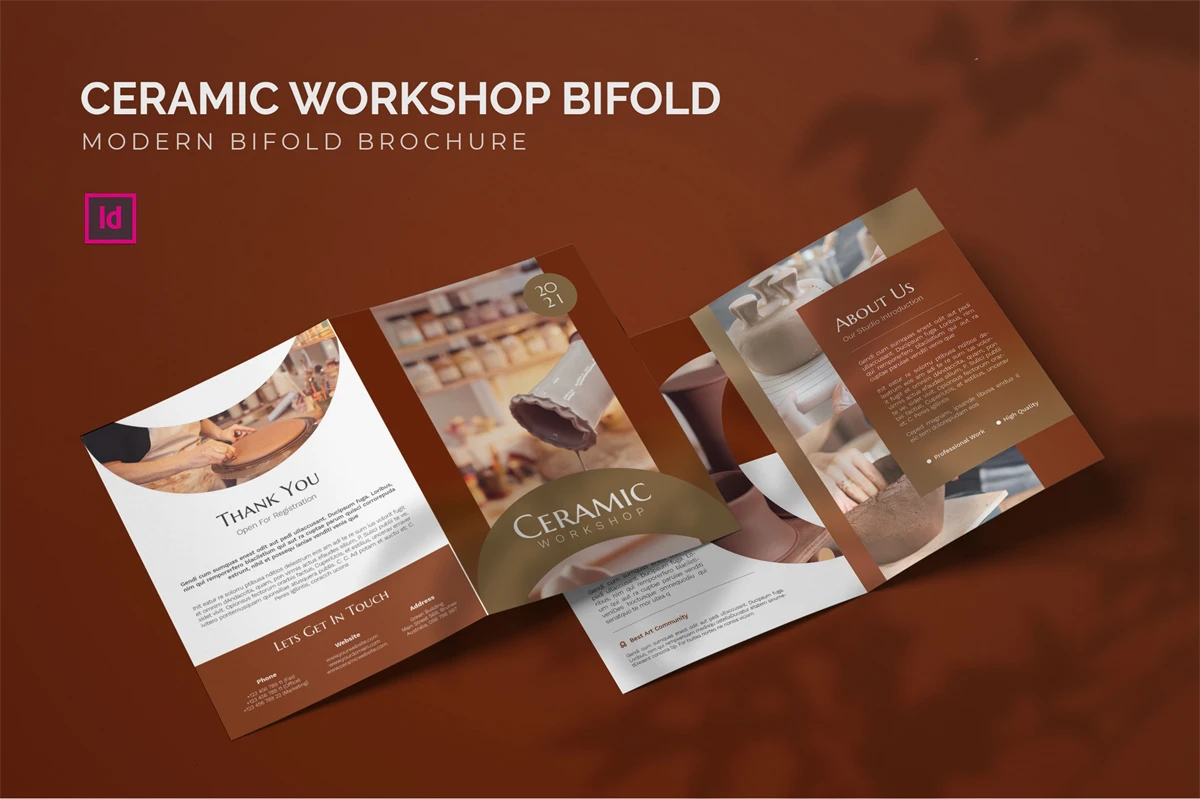 Ceramic Workshop - Bifold Brochure We present this Bifold Brochure for you, simple and very elegant, and this Bifold Brochure is suitable for all types of your business, made with adobe inDesign, very easy to customize, Hope you Like it, don't forget to rate, Thanks.