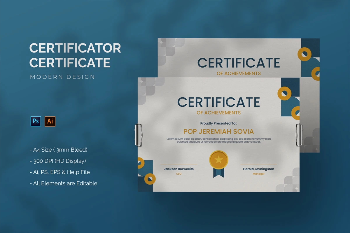 Certificator - Certificate Template Honor individuals or groups with a certificate that's more than just paper; it's a lasting memory of a job well done. With a classic layout and customizable elements, this certificate design template is a testament to the hard work and dedication that have led to success.