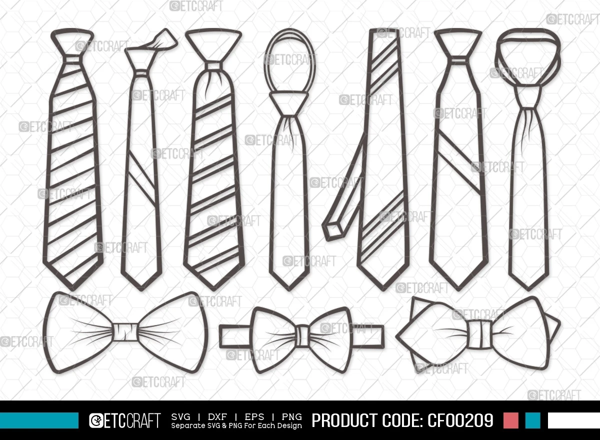 Don't miss the opportunity to add a unique, versatile, and high-quality collection of necktie-inspired designs to your creative repertoire. Acquire our Tie Outline Men's Wedding Tuxedo Suit Neckties SVG Cut File Bundle now and take your fashion, formal, and design projects to the next level!