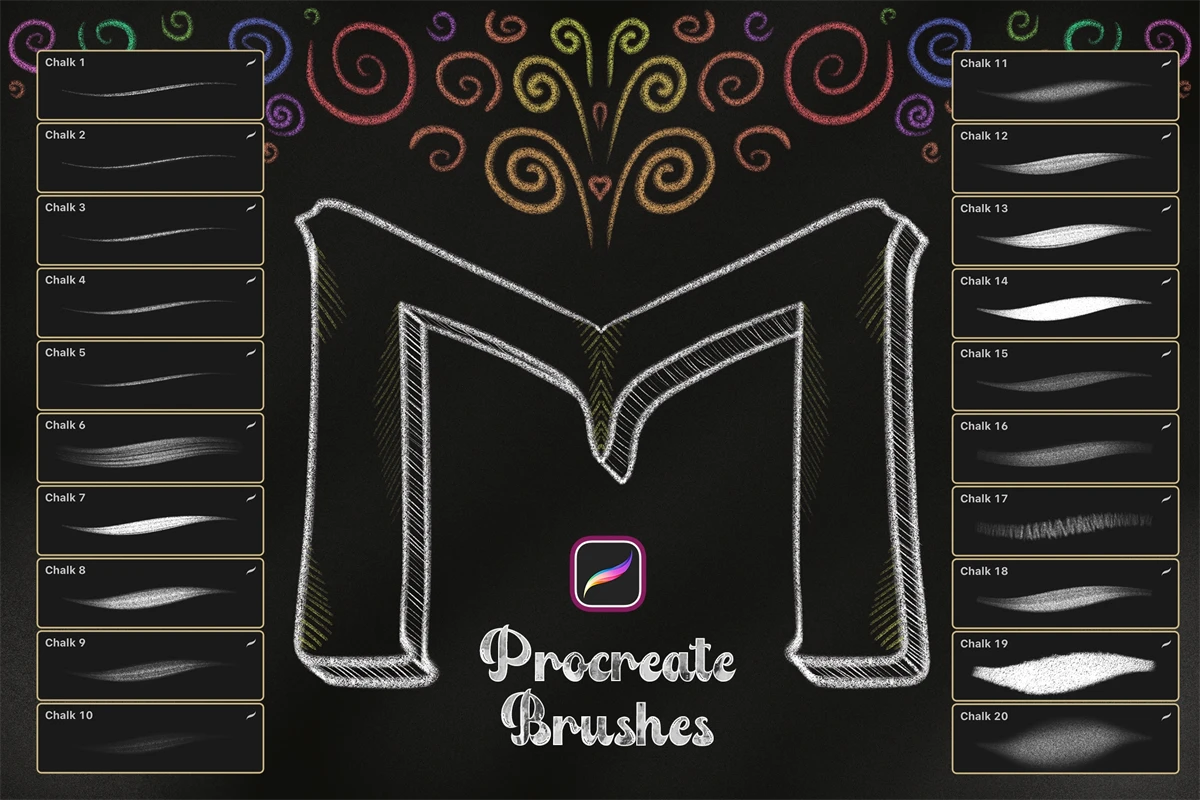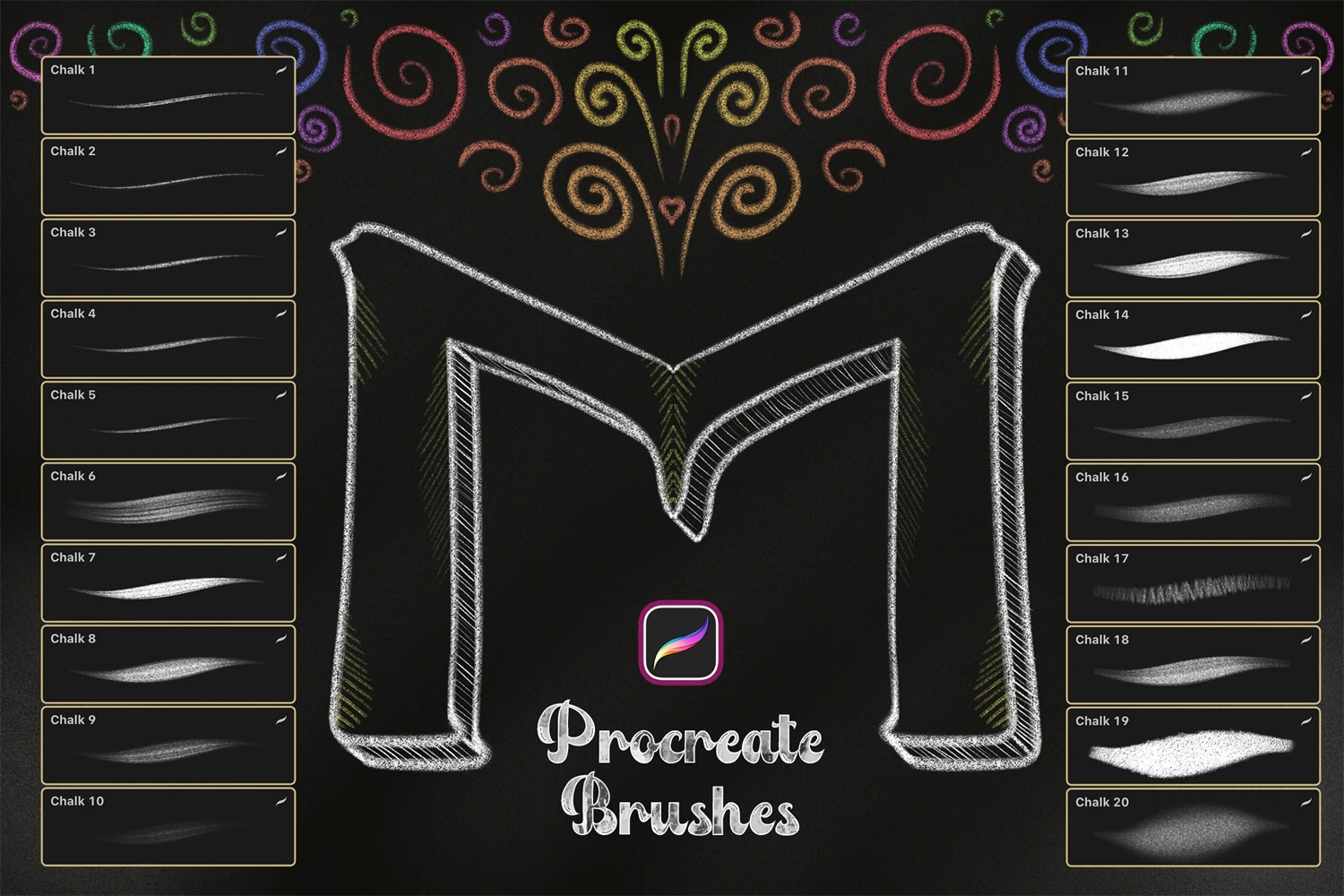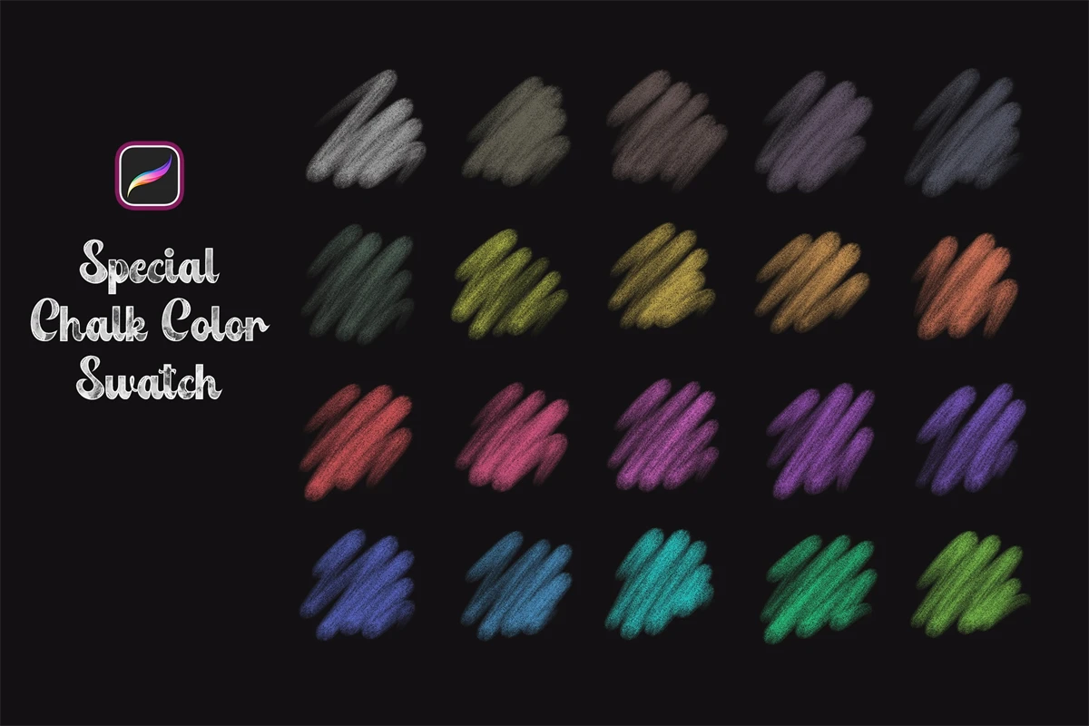 Get 20 chalk brushes for Procreate. Brushes are pen pressure sensitive. Enjoy creating chalk lettering, use prepared color swatches.