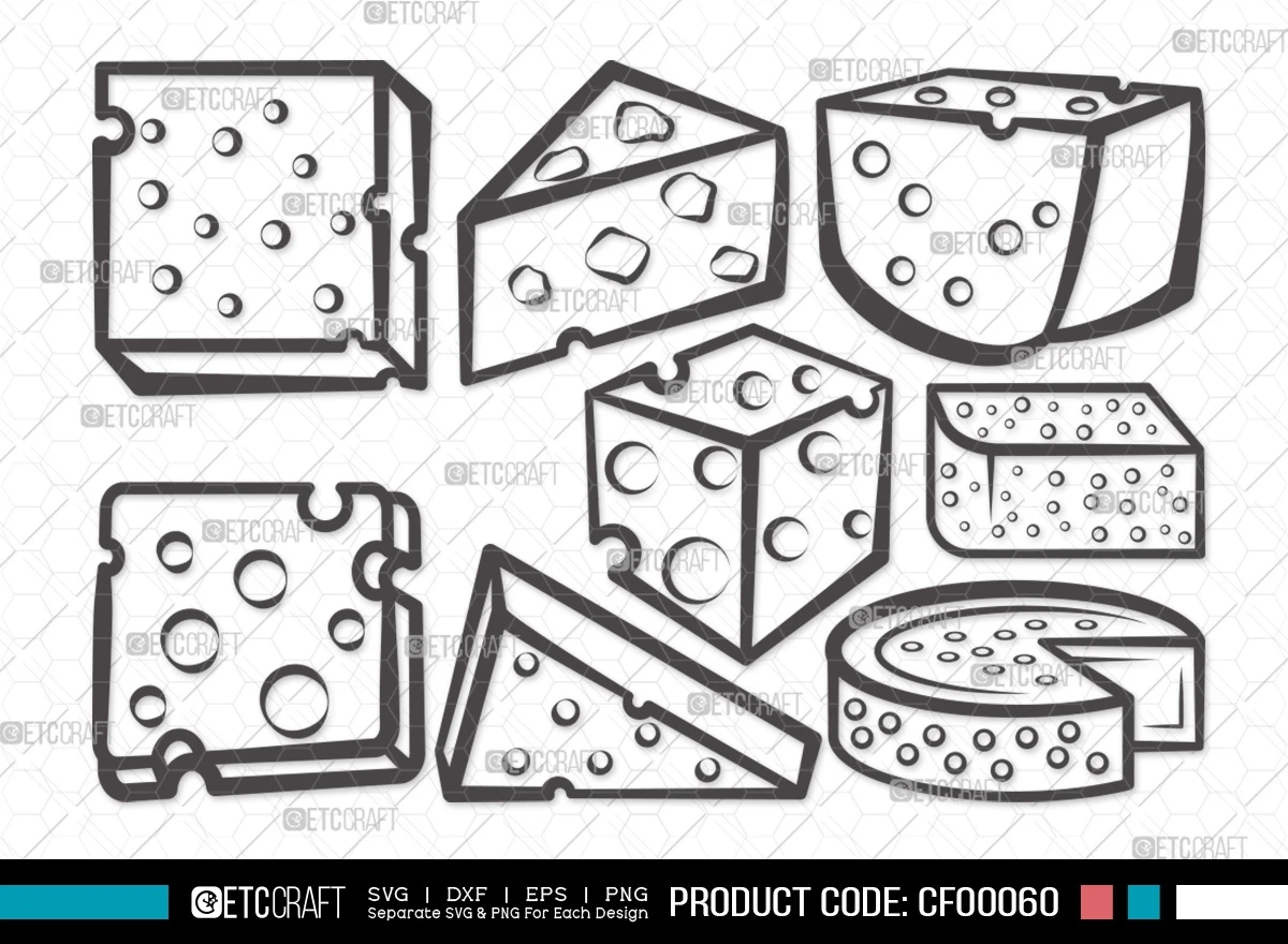 Explore the delightful world of cheese with our "Cheese Outline Cheesy Fast Food Slice" SVG cut file bundle. This collection of whimsical and cheesy designs adds a delightful flavor to your creative projects.