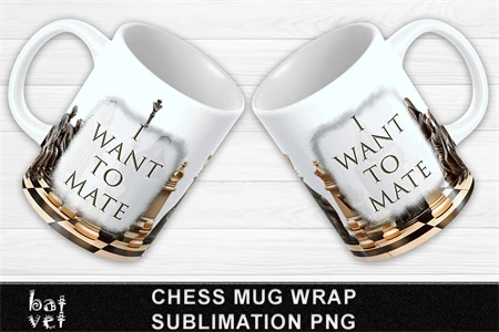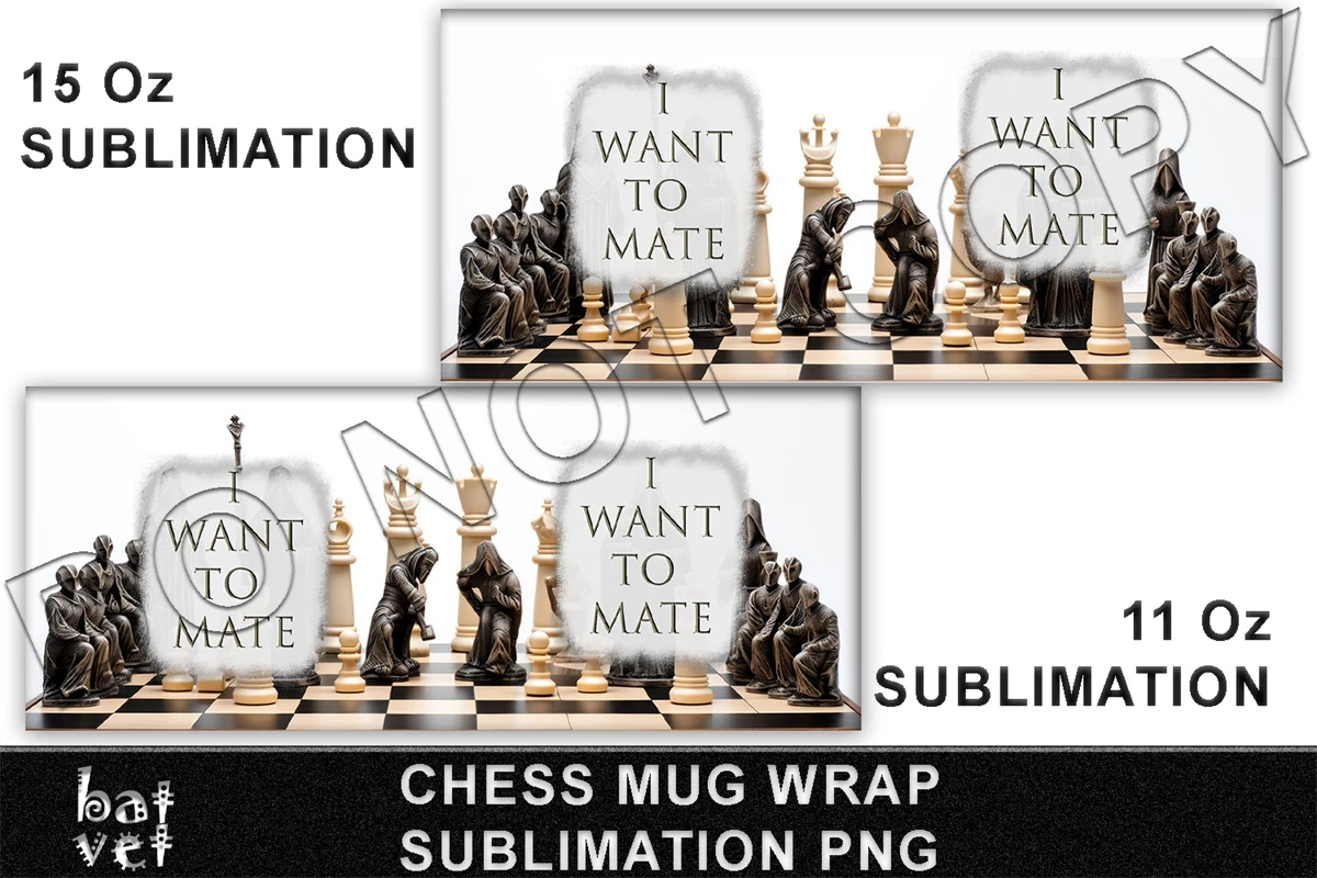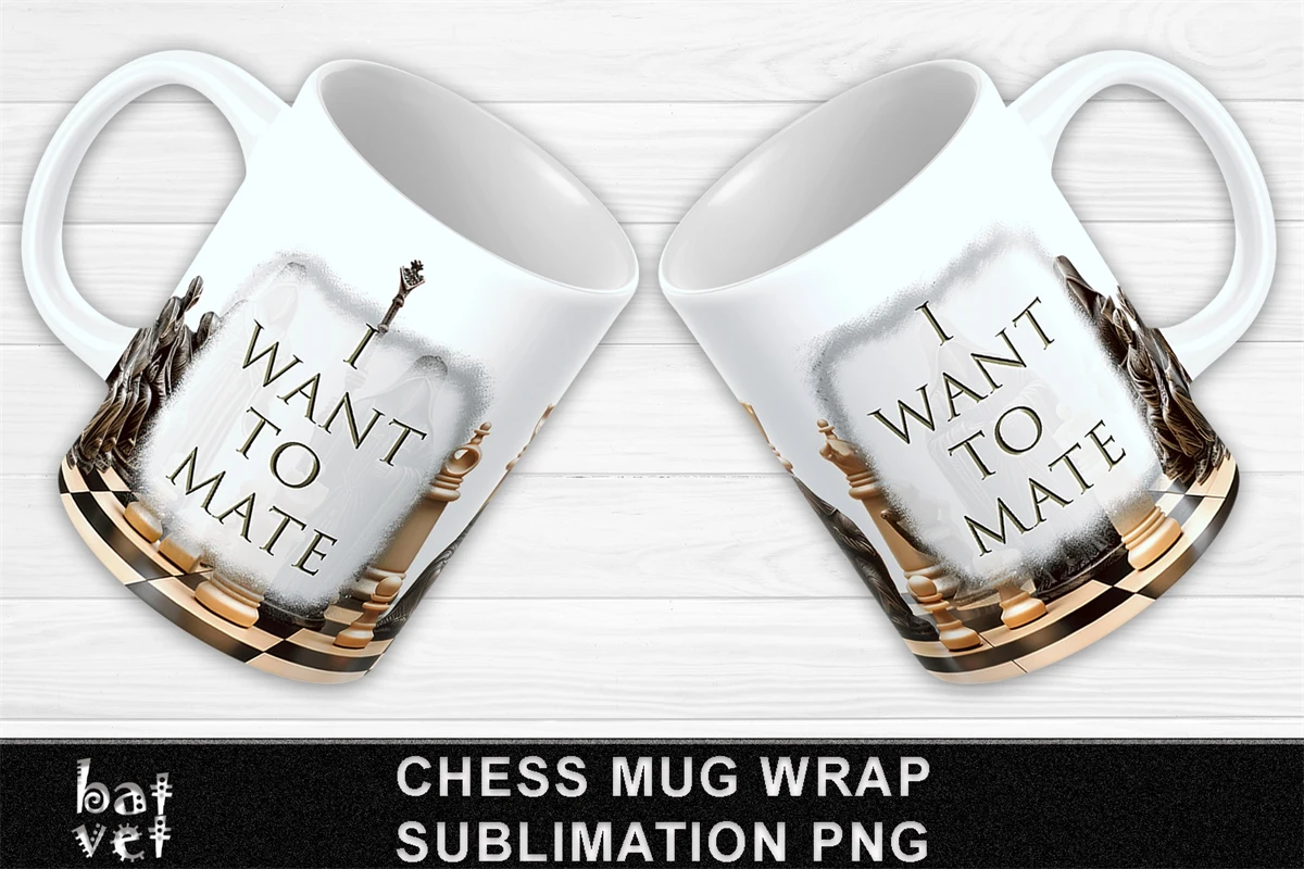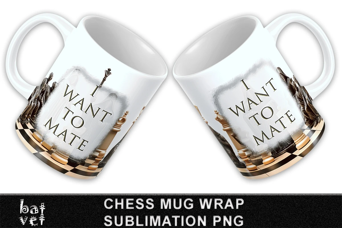 11 Oz Mug Wrap and 15 Oz Mug Design,Chess Board, Chess Figures, Checkmate Quote "I Want to Mate" Sublimation for Mug Print.