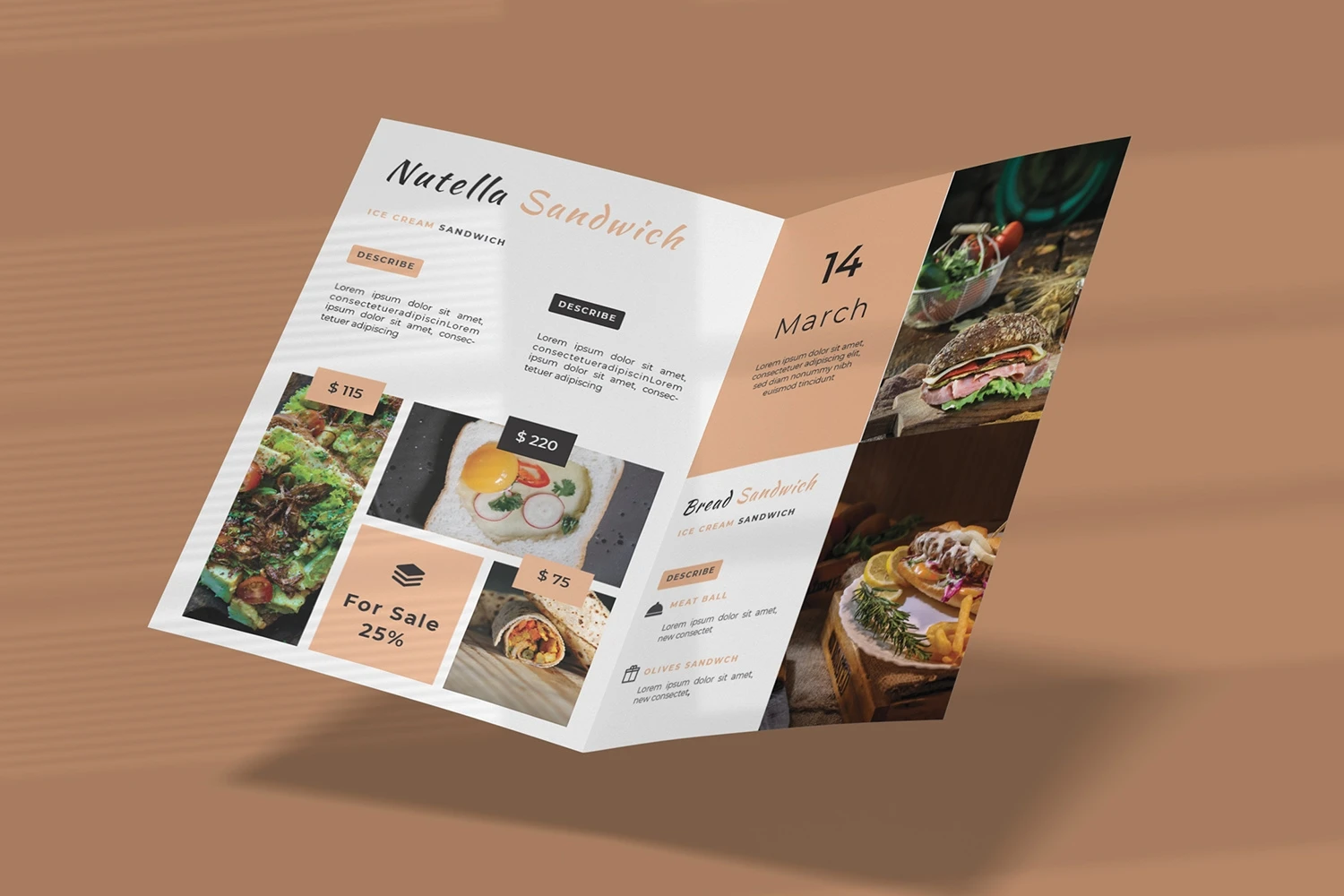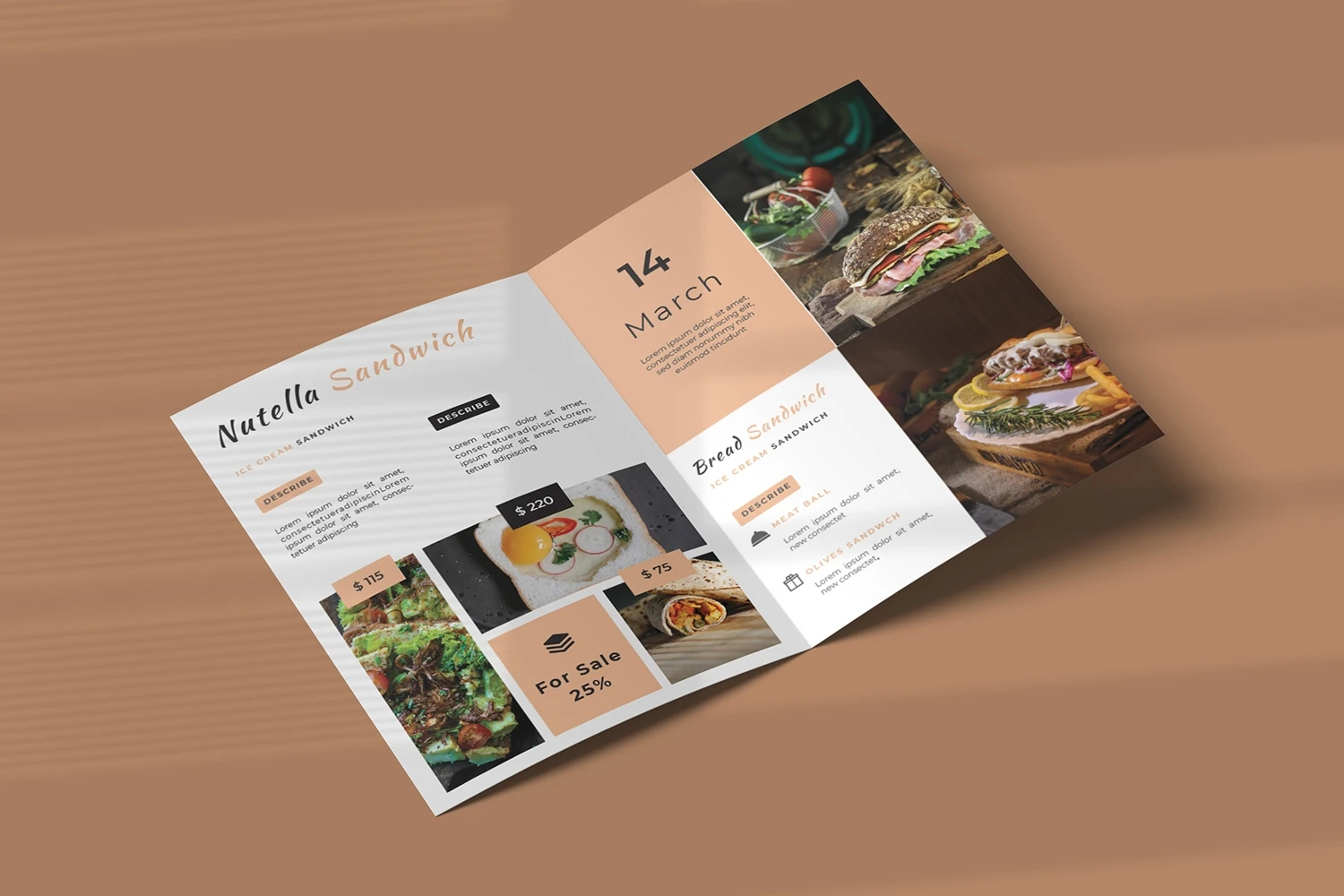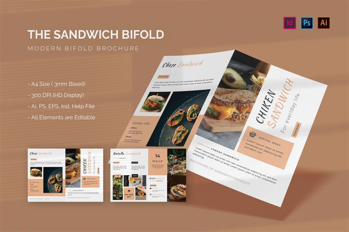 Chicken Sandwich - Bifold Brochure We present this Bifold Brochure for you, simple and very elegant, and this Bifold Brochure is suitable for all types of your business, made with Adobe InDesign (INDD), Adobe Photoshop (PSD) and Adobe Illustrator (AI), very easy to customize, Hope you Like it, dont forget to rate, Thanks.