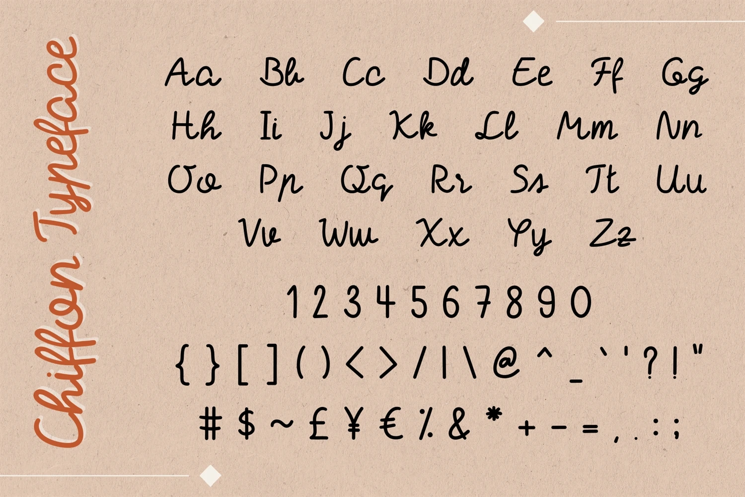 Chiffon Hand Written Font is a trendy and distinctive font that exudes confidence and style. Its bold, geometric letterforms and sleek lines make it a standout choice for modern design projects. This font is perfect for those looking to create a strong visual identity with a contemporary edge.