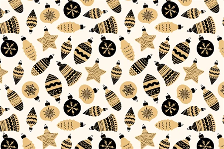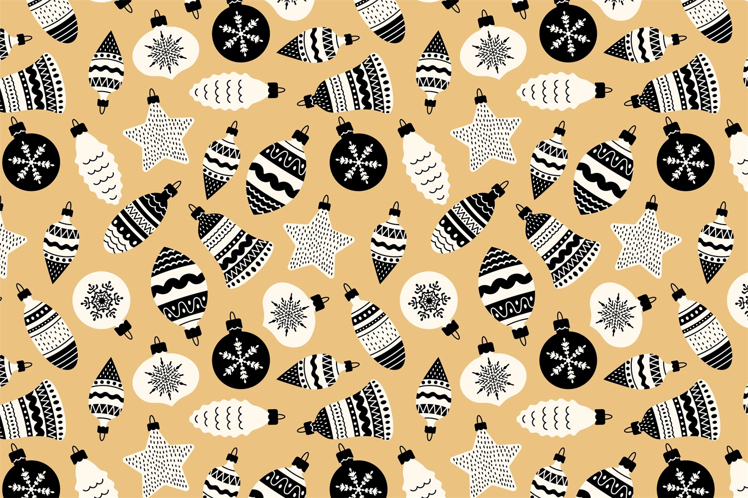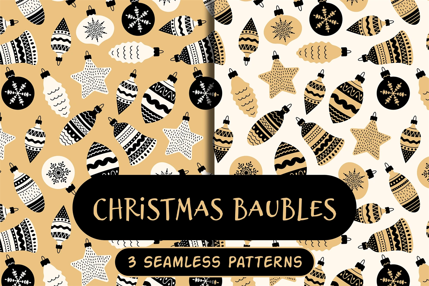 Elegant seamless patterns, digital papers, backgrounds for Christmas and New Year celebration. Winter holiday design with black and golden colors. Christmas ornaments with baubles, globes, Christmas bulbs, Christmas bubbles. Vector illustration.