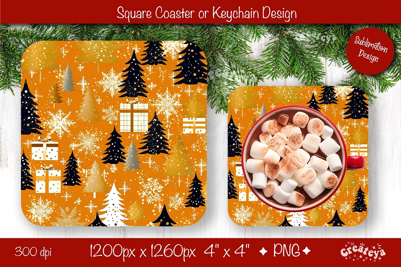 Square Coaster Christmas Coasters design with Christmas motif PNG. These standard square coasters 4'' x 4'' are more than just a way to protect your table they bring a touch of charm and a warm, fuzzy feeling to your home decor.