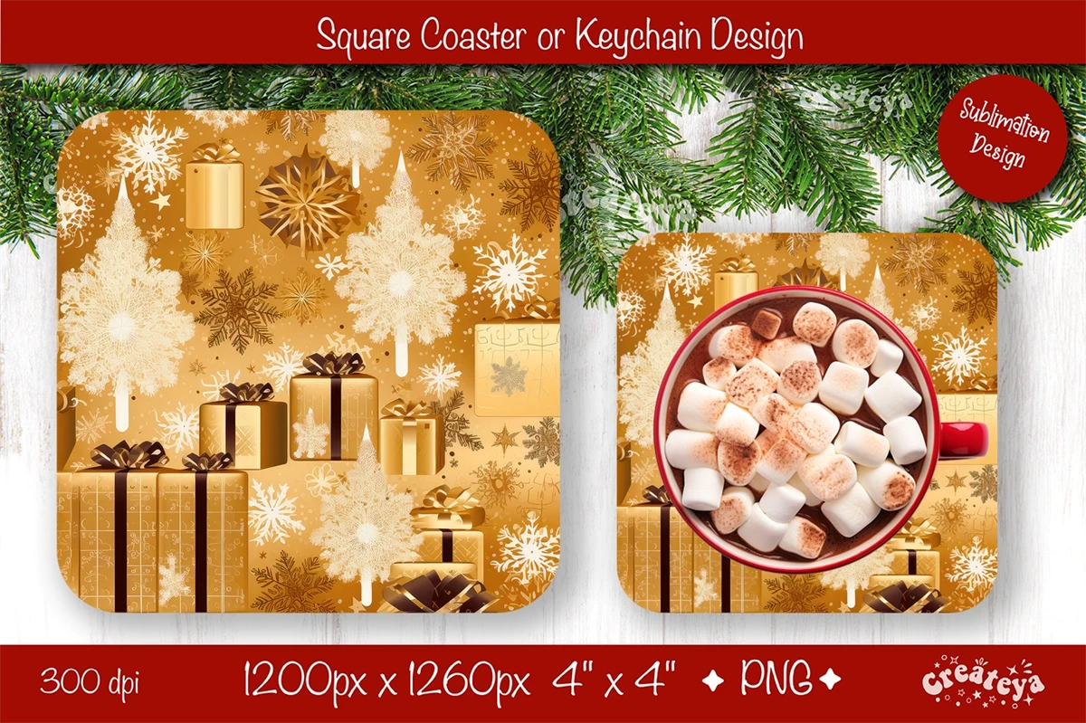 Square Coaster Christmas Coasters design with Christmas motif PNG. These standard square coasters 4'' x 4'' are more than just a way to protect your table they bring a touch of charm and a warm, fuzzy feeling to your home decor.