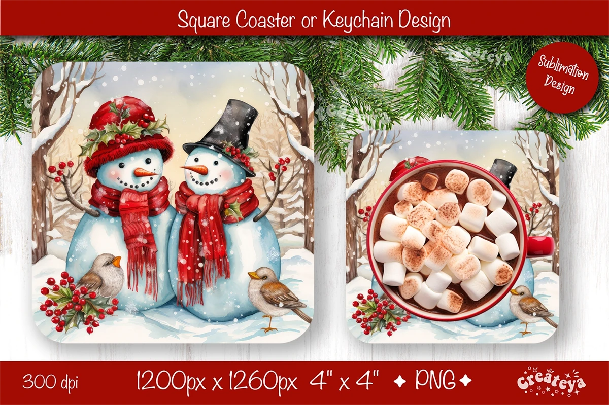 Square Coaster Christmas Coasters design with a cute Snowman PNG. These standard square coasters 4'' x 4'' are more than just a way to protect your table they bring a touch of snow-filled charm and a warm, fuzzy feeling to your home decor.