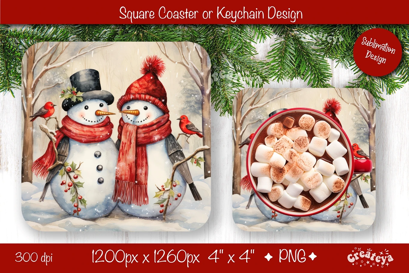 Square Coaster Christmas Coasters design with a cute Snowman PNG. These standard square coasters 4'' x 4'' are more than just a way to protect your table they bring a touch of snow-filled charm and a warm, fuzzy feeling to your home decor.